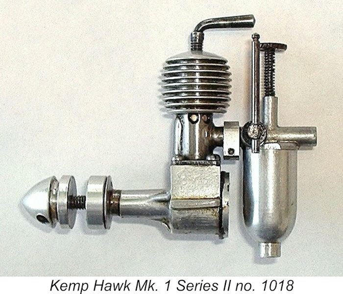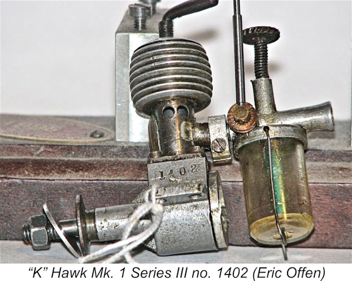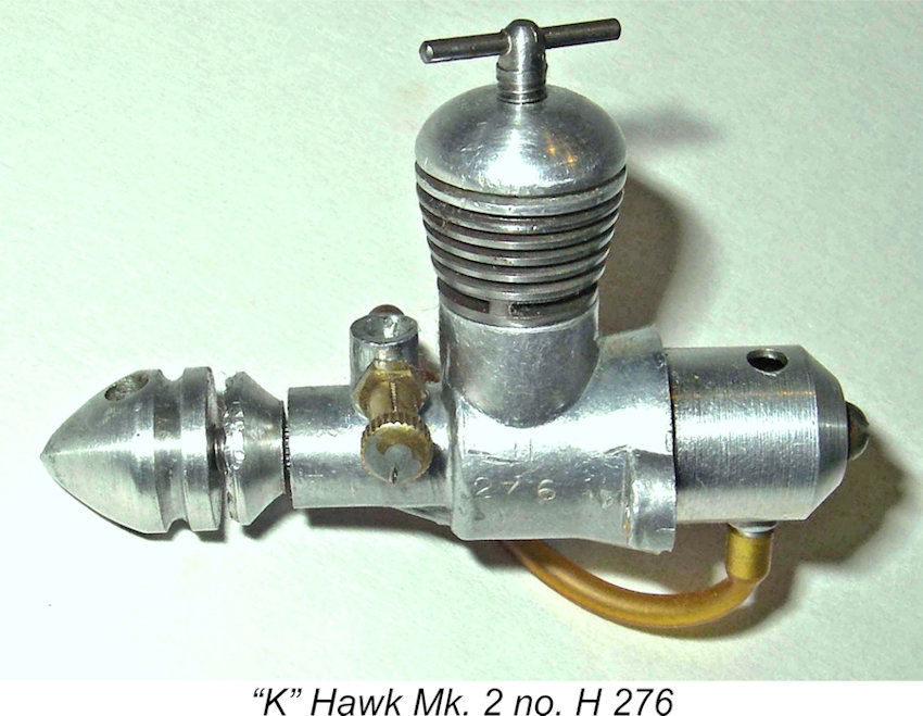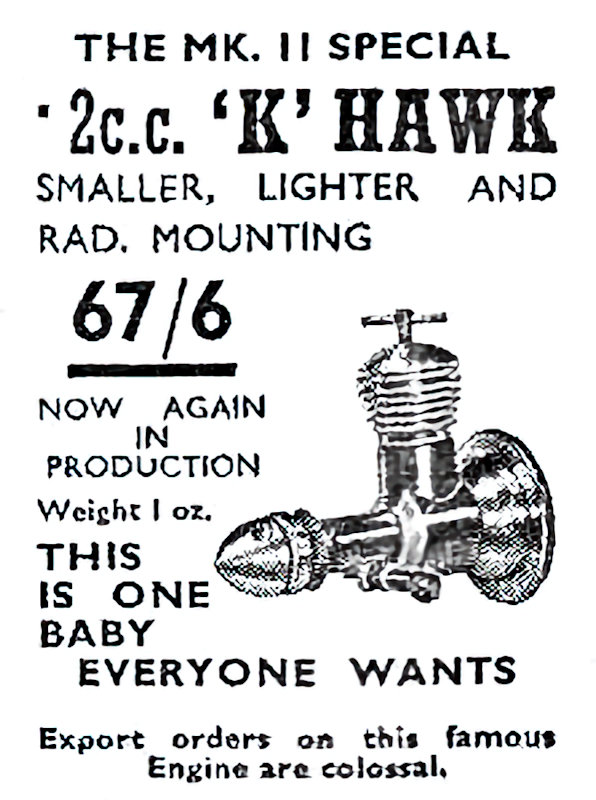 The Mk. 1 Series III version of the sideport Hawk seems to have survived in production for some time following the mid-1948 take-over by the "K" Model Engineering Co. However, the engine had disappeared from the manufacturer's advertising by December of 1948 and in May 1949 we find the company announcing a completely revised Mk. 2 model of the Hawk which used radial mounting in conjunction with front rotary valve (FRV) induction.