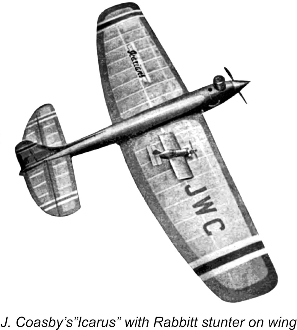 This model came to the attention of a well-known British pioneer stunt flyer named John W. Coasby, who worked as a draftsman for “Aeromodeller” magazine beginning in the late 1940's while also pioneering the large stunt model in Britain with designs such as "Taurus", "Icarus Senior" and "Yoicks" (all showing a 10 cc Nordec 60 powerplant on the plan!). Just to make a point regarding opposite ends of the spectrum, Coasby's "Icarus Junior" publication article in the April 1951 issue of "Aeromodeller" featured an illustration of Rabbitt's tiny model sitting on the wing of the 67 in. wingspan "Icarus Senior"! This evocative study in extremes is reproduced at the left.