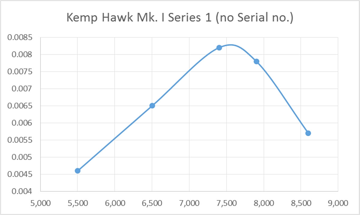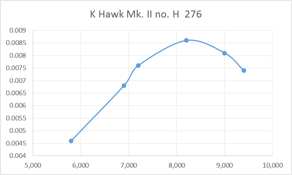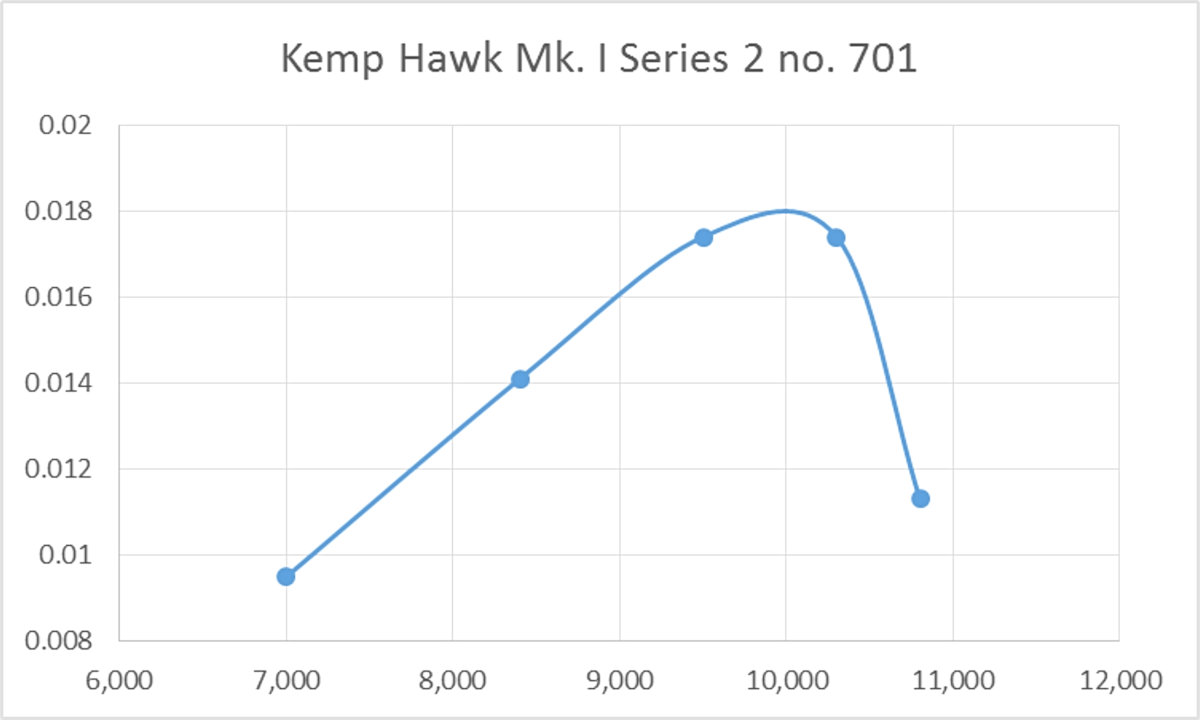 The above data confirms that the modified Hawk with its 30% greater displacement and far less convoluted bypass arrangements stands head and shoulders above its Series 1 predecessor. This particular example of the little Hawk delivered an outstanding performance, developing some 0.018 BHP @ 10,000 rpm. I have to say that this was well above my expectations. It's possible that this is a better-than-average example. Regardless, I would expect a more or less identical performance from the Mk. 1 Series III variant given the fact that its working components were identical. The FRV Hawk models