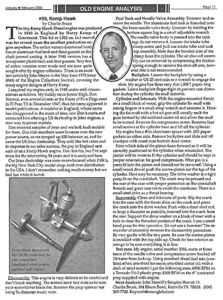 As we might expect, the 0.251 cc Hawk clearly developed considerably more useable torque than the 0.15 cc Bambi and would therefore swing a more efficient airscrew for practical purposes. The test report commented that the Hawk was unhappy at being pushed beyond the peak, a common characteristic of sideport engines. A test by Charlie Bruce of a Mk. 1 Series II Hawk which he had owned from new appeared in issue no. 59 of "SAM Speaks", the newsletter of the Society of Antique Modellers, for January/February 2003. This review is reproduced here at the right. Like all of Charlie’s reviews, this was mainly concerned with the engine's dismantling and reassembly, but a few test figures were included. Using a standard diesel fuel, Charlie obtained 6,900 RPM on a Tornado 5½x3 nylon prop, and 8,300 RPM with the 4 inch diameter laminated wooden airscrew supplied with the engine. It seems that the laminated wood prop was well matched to the engine's power curve. My own experience shows that a leak-free example of the Mk. 1 Hawk is a perfectly straightforward engine to handle once the correct needle setting has been found. However, finding that setting may take some time, and patience is strongly advised! My advice - start lean and work up to find the sweet spot - less chance of flooding that way.