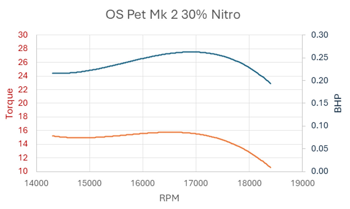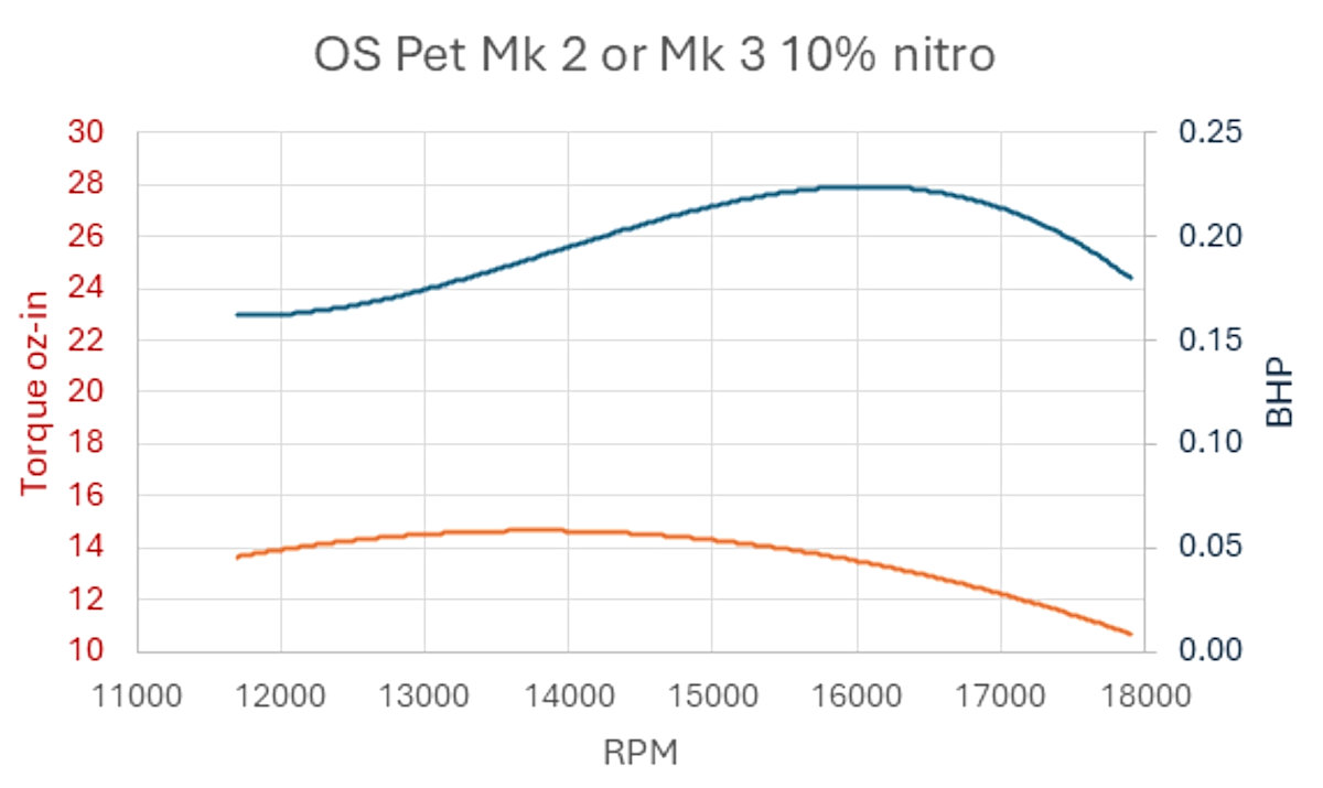 In addition, it’s sometimes not realized that for best results the Pet needs a glow plug of “Japanese” reach, which is actually slightly longer than a standard short-reach plug. A regular long-reach plug will protrude into the combustion chamber, upsetting running. A short-reach plug (which is actually a little too short) or an extra plug washer on a long-reach plug are far better make-do options. Finally, Ron Warring’s assertion that the crankshaft thread is 2BA is incorrect – it’s actually 10-32 NSF. A worn BA nut might go onto the 10-32 thread, but would it hold the propeller safely? O.S. Pets on TestWe had no Mk. 1 version available for testing. The reader will therefore have to refer to the published test reports referenced earlier. However, we had a pair of Mk. 2’s in very good shape and a very well-used Mk. 3 with soft compression seal resulting from a long active life. Straight fuel with 28% castor oil was specified for running-in. This requires the mixing of 2.5 parts methanol to 1 part castor oil. Alternative options had 25% oil and 10% or 30% nitromethane (the “Hot” option.) Any takers for the 15% nitrobenzene brew which was also mentioned? A dose of cancer, anyone?? Out of necessity, many users would doubtless make do with straight fuel. With the straight running-in mix, six drops from the syringe into the venturi or one choked turn followed by a light “dry” exhaust prime (piston closing the port) seemed to do the trick. Feel for the “bump” when turned over and then flick. Using this approach, the Pet would start easily, displaying no tendency to backfire or snap at a lazily-withdrawn finger. Very docile, in fact! For the Series 1 set of tests, we used an O.S. No. 8 (medium) glow plug with straight un-nitrated fuel. Neither the Mk. 2 nor Mk. 3 test units would hold a truly clean 2-cycle setting on this fuel. Needle adjustment was quite exacting and the engine would simply quit if set even a fraction lean. An Enya No. 3 (hot) plug was tried and found to be no better. Best running was obtained with light propellers, but it was obvious when each engine was running out of puff. The Pet Mk. 2 restarted quite readily when hot. The well-worn Mk. 3 was understandably not good in this respect, so we fitted a new piston/cylinder set and gave it the specified running-in time of 30 minutes, accumulated over a series of two-minute periods. We then repeated the tests, with little change in performance but greatly improved handling. Cold starts were then excellent and the engine seemed ready for work. However, restarting the “revived” Mk. 3 from hot was a five-minute job! Despite trying various priming regimes, it would either “play dead” or merely produce a weak burst - not quite enough to catch on. Eventually it would start, presumably after cooling down a bit. This is a not-uncommon trait among similar glow engines. The alternative is to wait patiently for five minutes for it to cool down, after which starting is easy. Peter Chinn also mentioned having trouble with hot restarting during his tests. Based on our first series of tests, we could begin to see why some people were not enamoured with their O.S. Pets. Allan Laycock managed to extract a so-so performance from his Mk. 1 with a 6x4 propeller. Stan Pilgrim and Bob Fisher sidelined their Mk. 1’s but had good results with Mk. 2’s (also with straight fuel) after increasing their compression ratios. A Series 2 set of tests conducted with some nitro in the fuel demonstrated that those able to afford a commercial sport fuel mix with 5% to 15% nitro had a completely different experience. We repeated our tests on both engines with 10% nitromethane fuel and an O.S. No. 8 (medium) glow plug. A modest RPM gain with this fuel was immediately noted. The engines’ response to mixture adjustment was now quite broad leading up to the establishment of an optimum setting. However, a truly clean two-cycle run was still not easy to adjust for when using larger propellers. Spit-back out of the venturi suggested relatively late intake closing for such loads. By contrast, on lighter propellers running became smooth, and both engines were a pleasure to operate. As a bonus, the “revived” Mk. 3 now restarted easily when hot. The piston with its baffle notch is inherently heavier than average and the crankshaft has no counterbalance. Not unexpectedly, moderate vibration appeared at the very highest test speeds, but vibration levels would be fine with more practical propellers for actual service. We completed our testing by conducting a Series 3 test series using the Mk. 2 on the manufacturer’s recommended Hot 30% nitro fuel. The engine absorbed this brew quite happily. Not unexpectedly, a further performance gain was noted. Performance analysisThe RPM results and derived performance curves were remarkably consistent between our test Pet Mk. 2’s and Pet Mk. 3, the later with both worn and fresh piston/cylinder sets. This allows us to present values typical of both types. For the initial Series 1 tests with standard fuel, torque averaged 13 oz-in through to the peak power zone between 15,000 and 16,000 RPM for a creditable 0.21 BHP. However, this dropped quickly at speeds above this range with lighter propellers. The Mk. 2’s 50% gain over reported figures for the Mk. 1 Pet is testimony to the effectiveness of the Mk 2’s detail improvements, and the company was apparently happy to replicate the same handling and performance when designing the Mk. 3. The moderate nitromethane fuel mix used in the Series 2 tests turned Mk. 2 and refurbished Mk. 3 Pets into delightful performers. Torque went up slightly to 14 oz-in, bumping power to 0.225 BHP at around 16,000 RPM. The Series 3 tests with Pet Mk. 2 and the specified Hot 30% nitro fuel mix revealed no sign of pre-ignition, nastiness or strain. Torque was boosted to 16 oz-in in the business zone. Test propellers showed an average 600 RPM gain. The power curve was rais