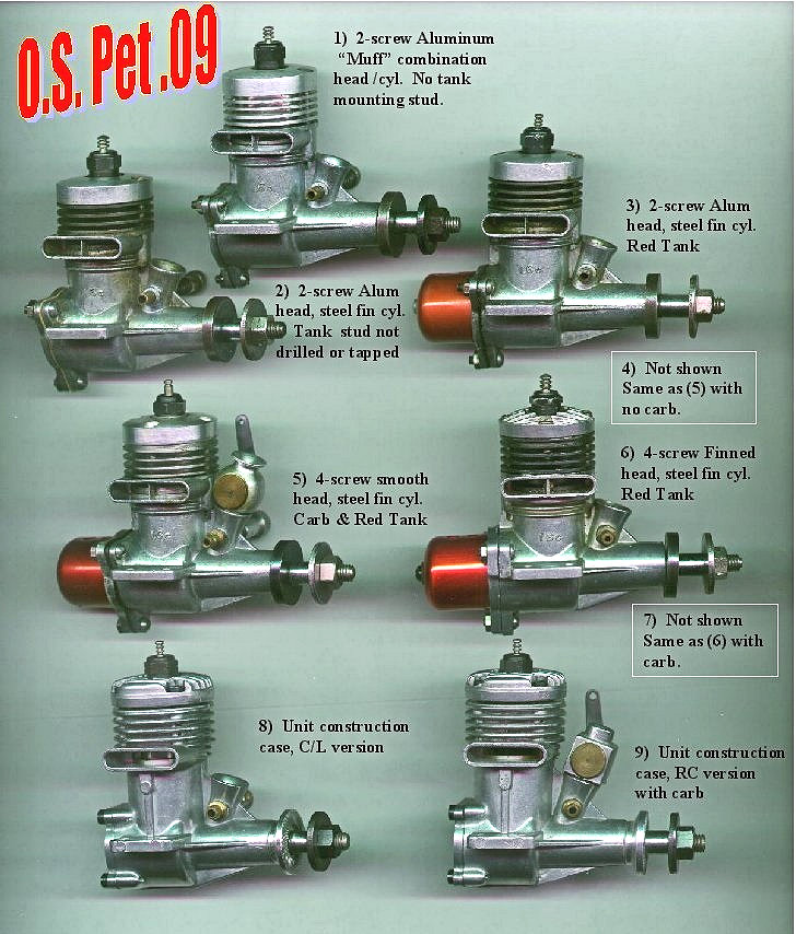 By the late 1950’s, O.S. was on a roll. They now had new expanded production facilities well equipped with modern machinery. The members of their excellent MAX range of glow-plug motors were in high demand throughout their world-wide The O.S. Pet 09 which replaced the earlier New 099 in 1957 benefited from O.S. MAX engine experience and know-how, which offered the prospect of providing improved performance that would be competitive in foreign markets. Low cost and easy operation by novices were also goals that were very much in mind. The Pet’s design took advantage of American production techniques as applied to their mass-produced ½A engines, with the clear objective of minimising production costs. This resulted in a remarkably low $4.95 price tag in the USA at a time when Herkimer was dropping the price of their OK Cub 049A to $3.95 to maintain market volume dominance. The Pet was produced in a wider range of distinct variants than many people realize. We'll briefly summarize those variants next. The O.S. Pet Variants