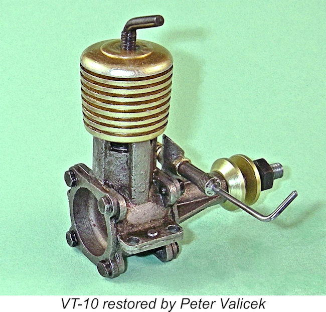 now very different in design terms - no attempt was made to resume production of the old VT designs. Instead, the revived operation focused on the development and manufacture of a series of very up-to-date Schnuerle-ported glow-plug motors. A series of racing engines having a somewhat odd-ball displacement of 1.8 cc was manufactured for both cars and airplanes, along with a very handsome 6.5 cc FRV model presumably intended for pylon racing.