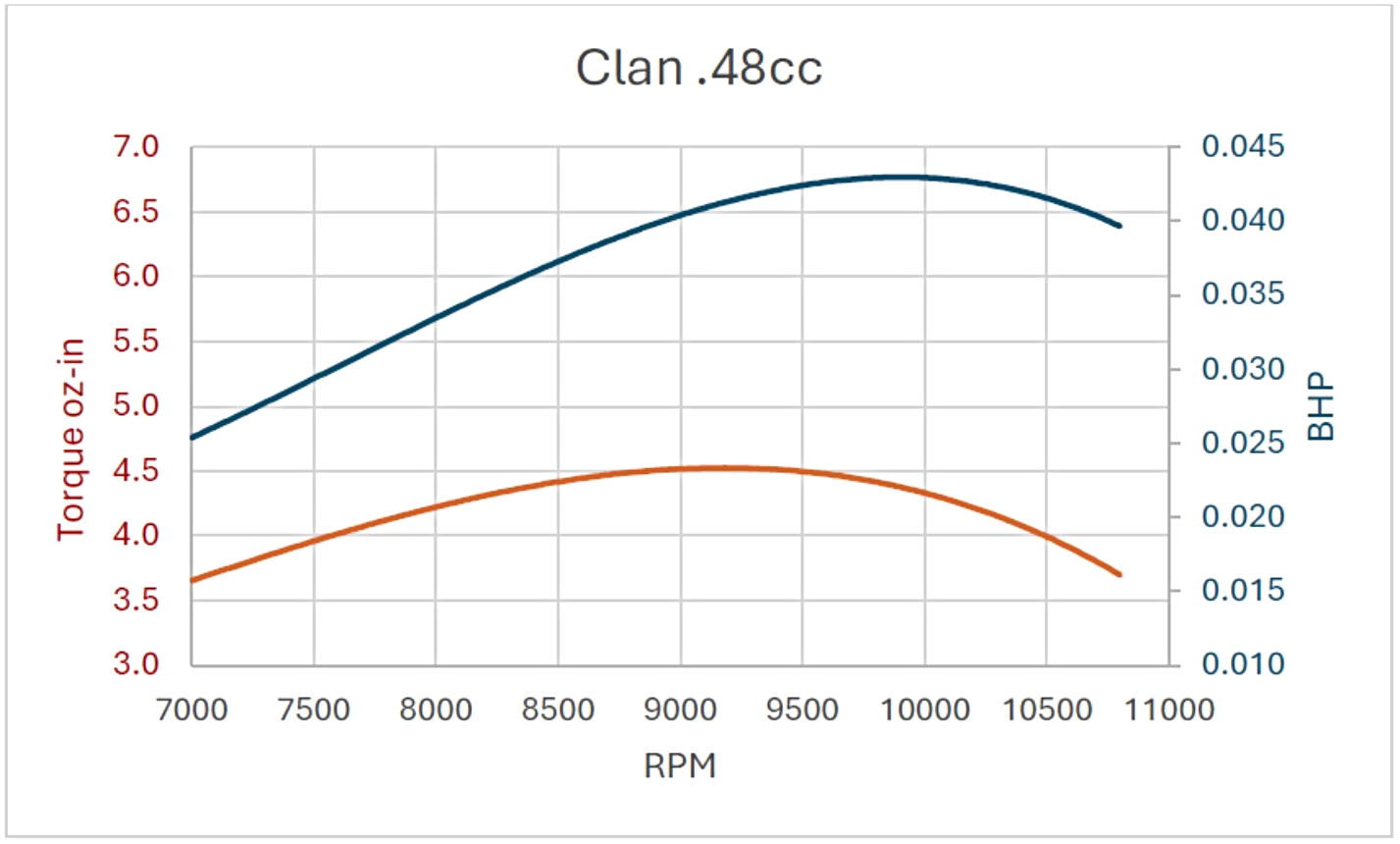 Once running, repeatable readings could not be achieved despite adequate piston bedding-in through a series of break-in runs. The tendency to sag when seeking top RPM with a given load might seem to confirm the previously-mentioned reports from other owners of a tendency to overheat. However, in this case we diagnosed a dry crankshaft bearing problem. This is not uncommon with side-port induction designs if no pathway to the bearing for lubricating oil is provided. The issue is easily solved by cutting a vertical groove in the crankcase face where the crankweb bears when running. Following this simple modification, the Clan .48 ran reliably. Response to the controls was progressive and a useful range of toned-down speeds could be had with balanced adjustment of compression lever and needle. Regular diesel fuel formulas are fine, as is our preferred brew: equal parts ether, kerosene and SAE 50 mineral oil, with 0.8% added ignition improver. Performance analysis As noted earlier, absolute performance numbers from such small engines are significantly affected by piston fit. Ours was a bit tight (at least when cold) and, judging by progress during the bedding-in stage, will likely remain that way for a lot of useful flying time. That said, it showed no sign of causing trouble and can thus be considered “good”.