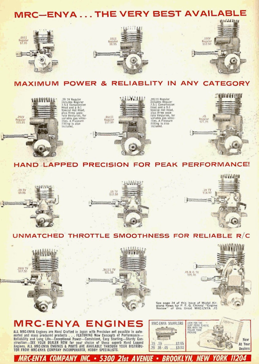 MRC had been established in 1947, initially focusing on the production of electrical components for model railroads and slot cars. Over its history, MRC pioneered realistic train controls and became a leading after-market manufacturer of AC, DC, and DCC model train controls and sound systems. The company was very successful, expanding into the distribution of various hobby products such as model kits, model engines, diecast models and radio-controlled aircraft. It was during this diversification phase that the MRC-Enya partnership was established. The new company promoted the Enya model engine range very energetically thereafter.