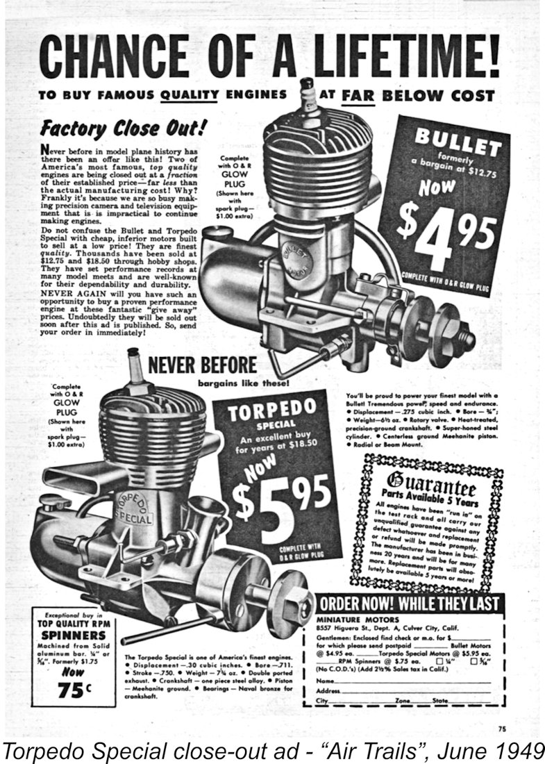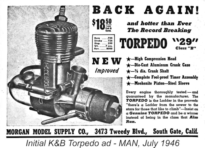 Another comment that appears in John Pond's article is the notion that the promotional image of the Torpedo Special which appeared in their advertisements was simply a touched-up rendition of the promotional image used by K&B to promote their K&B Torpedo 29 model! That image first appeared in a July 1946 advertising placement in MAN by the prominent model goods distribution firm of Morgan Model Supply Co. of South Gate, California. According to John Brodbeck, Bob Morgan had purchased half of the initial production run of the K&B 29, thus helping to jump-start the K&B venture.