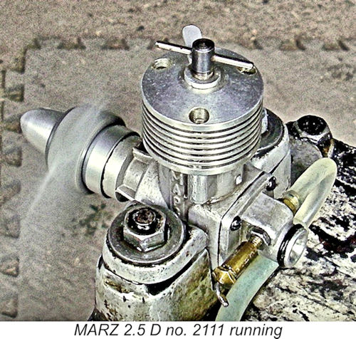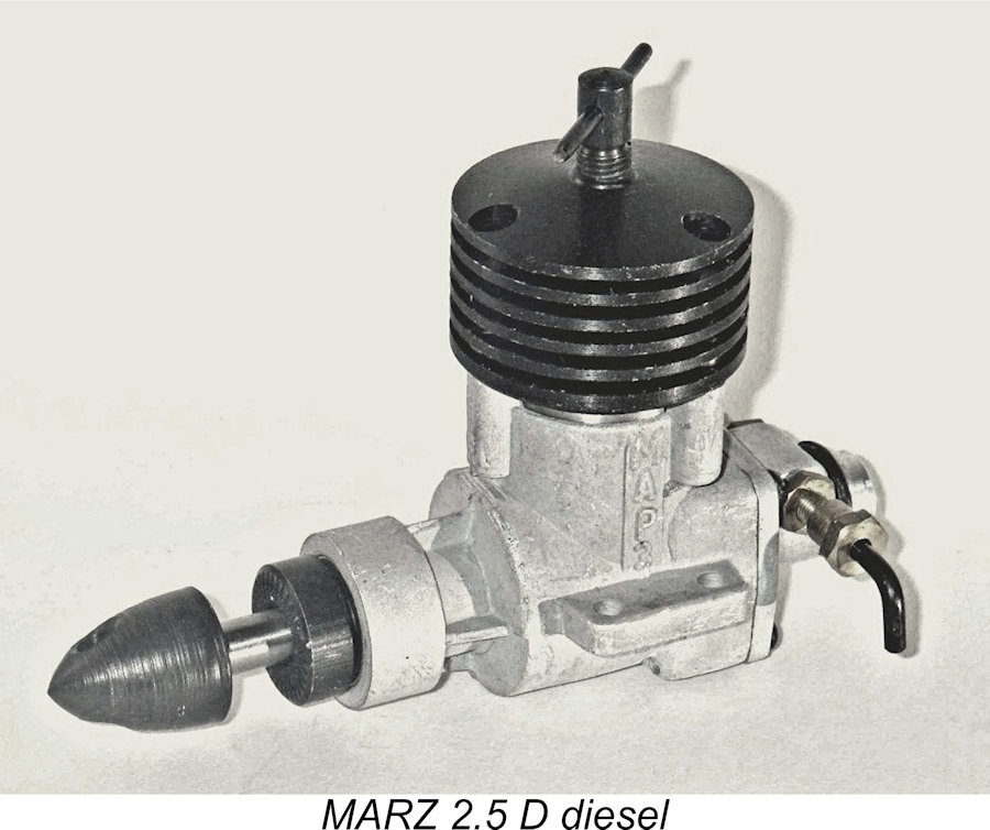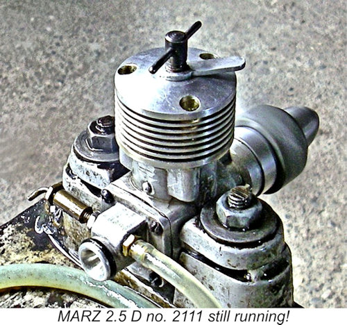 Otherwise, the MARZ is a more-or-less conventional twin ball-race diesel of classic "racing" pattern, with three conventional radially-disposed sawn exhaust ports completing the gas flow arrangements. Fits and finishes are generally good, although there are a few potential flaws (to be discussed below) arising from the fact that the engines were very much "mass-production" items dating from a time and place during which production quantity was far more highly valued than quality. The bare weight of 5.5 ounces (156 gm) is by no means excessive for an engine of this specification and performance, while the unit has a nicely compact appearance with a very low frontal area. Production and Distribution