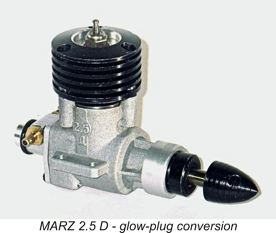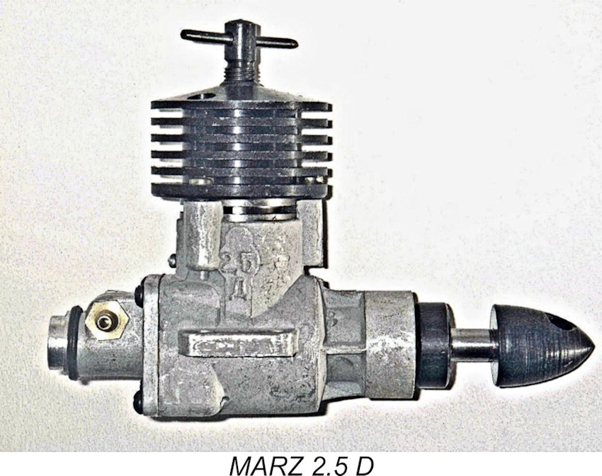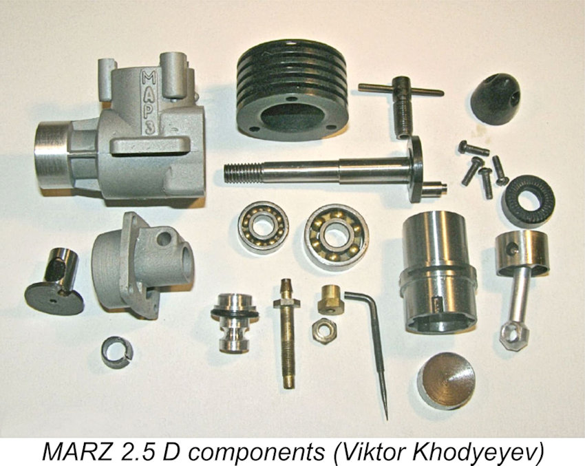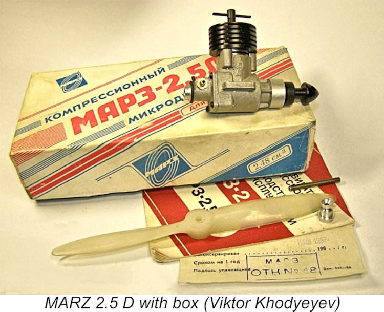 In the late 1960’s, a group of Moscow-based Russian competition experts known collectively as the Central Sports Model Flying Club (ZSKAM - Russian ҴCKAM) was assigned the primary responsibility for the ongoing development of commercial Russian competition engines. In a separate article on this website, I’ve traced the history of the engines which were designed by this group and distributed under the ZSTKAM name. The advent of ZSKAM (later ZSTKAM) signaled a noticeable improvement in the quality of many new series-produced Russian designs, particularly since the manufacture of the more promising models developed by the group was assigned by DOSAAF to a number of military production facilities to which DOSAAF had some level of access. These facilities generally worked to significantly higher manufacturing standards. Although its design pre-dated the central involvement of ZSKAM, the RITM remained in production in its later versions until at least 1975 - I have a New-in-Box example factory-dated from that year. It was seemingly in the late 1970's or soon thereafter, according to some rather sketchy information gleaned by the late US model engine importer Ed Carlson from business contacts behind the Iron Curtain, that the engineering department of the University of Moscow took a hand. The unsubstantiated story runs that they were asked by DOSAAF to investigate the problem of coming up with an improved design for a 2.5 cc competition training diesel suitable for mass production at reasonable cost and that the MARZ 2.5 D was the result. The primary objective was seemingly to develop an updated replacement for the MK-12V model which could be produced by the same Moscow facility. It's unreasonable to expect that we'll ever be able to prove or disprove this story, but it does make a great deal of sense. Although the influence of a number of previous Russian engines and others from elsewhere is quite clear in its design, the MARZ displays a refreshingly original combination of features which reflect a considerable amount of practical thinking in engineering terms. It would have made an excellent design assignment for a group of mechanical engineering students working under expert supervision in accordance with clear terms of reference. Based on first-hand information supplied by Ilya Leydman, it appears that an increasing proportion of Russian model engines during this period were manufactured by arrangement with DOSAAF in normally-restricted military production facilities as an off-peak activity to promote full utilization of equipment and staff. The MARZ 2.5 D was produced in a Moscow plant which was dedicated primarily to the servicing of military helicopters. Indeed, the name "MARZ" was derived from the Russian-language initials of the facility which made the engines - in English, the "Moscow Aero Service Factory". This facility had previously undertaken the manufacture of the MK-12V diesels and the Moscow and Meteor diesel and glow-plug models which preceded the MARZ. Description