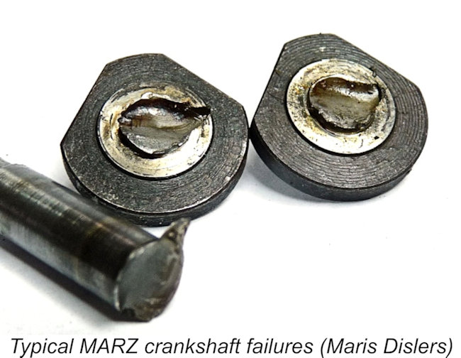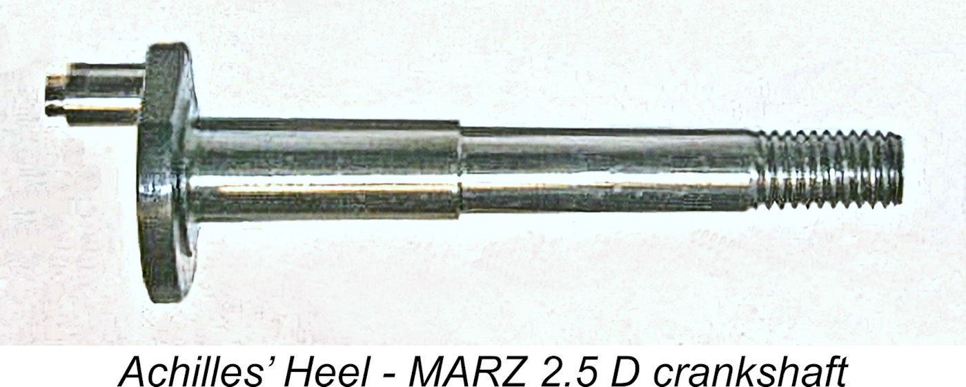 When I first started using the MARZ engines in June 1997, I noted the above points and accordingly anticipated no problems with the crankshaft. Alas, in service these shafts have unexpectedly proven to be the one potential Achilles' Heel of the MARZ. Since I started using MARZ engines myself, I naturally followed the fortunes of other users of the engine in my area. In the intervening years, I saw no fewer than four MARZ engines break their crankshafts in normal operation (as opposed to crashing or other abuse). Three of these were owned by others, but the fourth was my own favorite MARZ no. 2111, which broke its crank in flight after only 5 hours of running time (I log all my engine runs), admittedly for the most part in flight at or near its peak after break-in. All of the others failed after logging generally similar amounts of running time. It must be stressed that by no means all MARZ engines of my acquaintance have suffered in this way - I know of some which are still hanging together after quite a few hours of hard running. And I have yet to hear of a glow-plug model failing in this manner. But four relatively early shaft failures out of a group of some 12 or so diesels with which I have had direct operational contact does give reasonable grounds for concern, and there has to be a reason for such a relatively high proportion of failures of the same apparently sturdy component. All of these failures were identical in nature - the crankweb sheared off cleanly at the point where the shaft journal joined it. As noted earlier, the unavoidable corner at this point is nicely radiused during the grinding of the journal and the journal diameter itself appears more than adequate for the job - you'd actually expect the far thinner crankpin to go first. Therefore, the problem must surely be either with the steel used or with the heat treatment applied - more likely the latter in my personal view, given the fact that the crankpins don't seem especially vulnerable to failure. The break invariably presents the appearance of a brittle fatigue failure, so perhaps some of the shafts are over-hardened or prone to the development of internal stresses at that particular point during manufacture. Certainly, the very short-stroke design is bound to place higher-than-normal cyclic shear stresses upon this point due to the high combustion loads allied to the pounding action of the big-bore piston transmitted through the conrod – perfect conditions for initiating a fatigue failure.