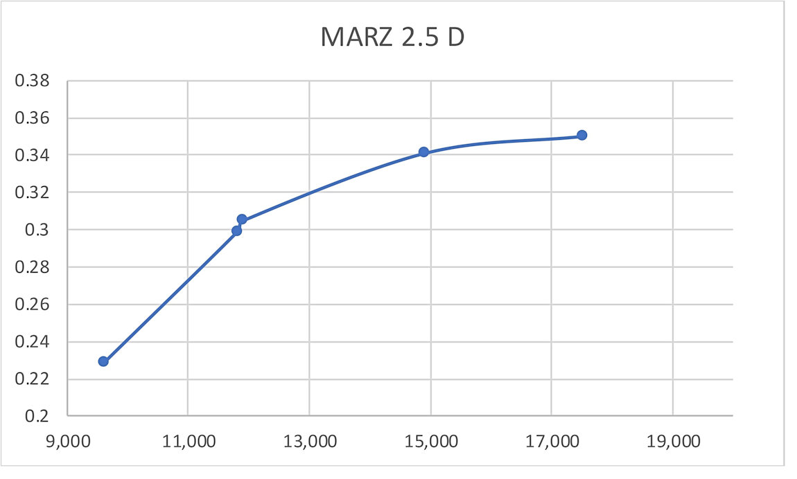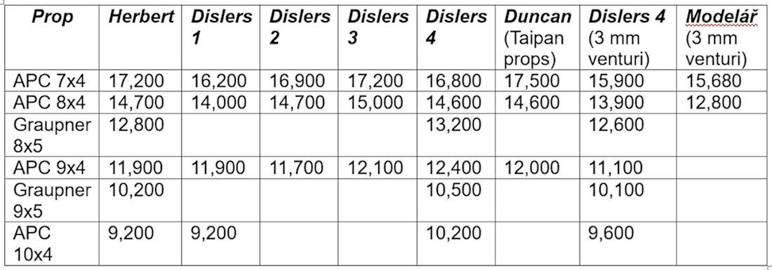 The original instruction book lists 3 mm as standard and 3.5 mm as an added option. Mine has had the line for the 3.5 mm venturi crossed out before despatch. This suggests that field testing had shown the smaller venturi to be best suited to the majority of users. All Macheast offerings that I’ve seen have had 3.5 mm venturis fitted, partially explaining their reputation for somewhat inconsistent running in the air. Performance Test ResultsThe MARZ was extensively tested/reviewed in the UK, Czechoslovakia, Canada and Australia – diesel, glow, with and without muffler, large and small venturi. I’ve set out the observed effects of these variables in general terms above. Some reviews provided performance curves, others only a table of propellers and associated RPM. How about a summary of “typical” open-exhaust diesel performance? Like the MK 12 series engines that it replaced, the MARZ is essentially analogous to the Webra Mach 1. The use of modified Arden-style cylinder porting means plenty of noise and a notable thirst for fuel, particularly with the 3.5 mm venturi. Despite its short stroke, the engine develops decent low-end torque, but it’s certainly not in the “slogger” category. It develops its maximum power at relatively high speeds for a 1950’s core design. Working fits and finishes will undoubtedly affect individual performance outcomes. For comparison purposes, I’ve tabulated available prop/RPM results using Richard Herbert’s chosen propeller set.