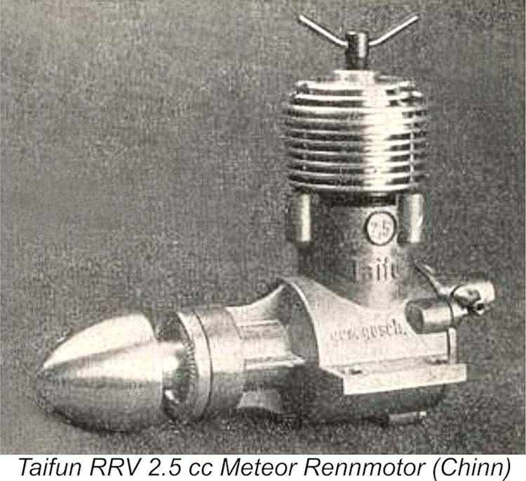 Six distinct models were offered, all of which were given individual names – the 1 cc plain-bearing model was the Taifun “Junior”, the 1.5 cc plain-bearing offering was the Taifun “Record”, the 2.5 cc plain bearing version was the Taifun “Blitz”, the 2.5 cc crankshaft front rotary valve (FRV) ball-race model was the Taifun "Meteor", the 2.5 cc disc rear rotary valve (RRV) ball-race model was the “Meteor Rennmotor Spezial” (Meteor Special Racing Engine), and the 3.5 cc unit was an over-bored and up-stroked "Meteor Rennmotor" marketed as the Taifun "3.5 cc Spezial”. Only the latter two models featured RRV induction, the others being FRV designs.