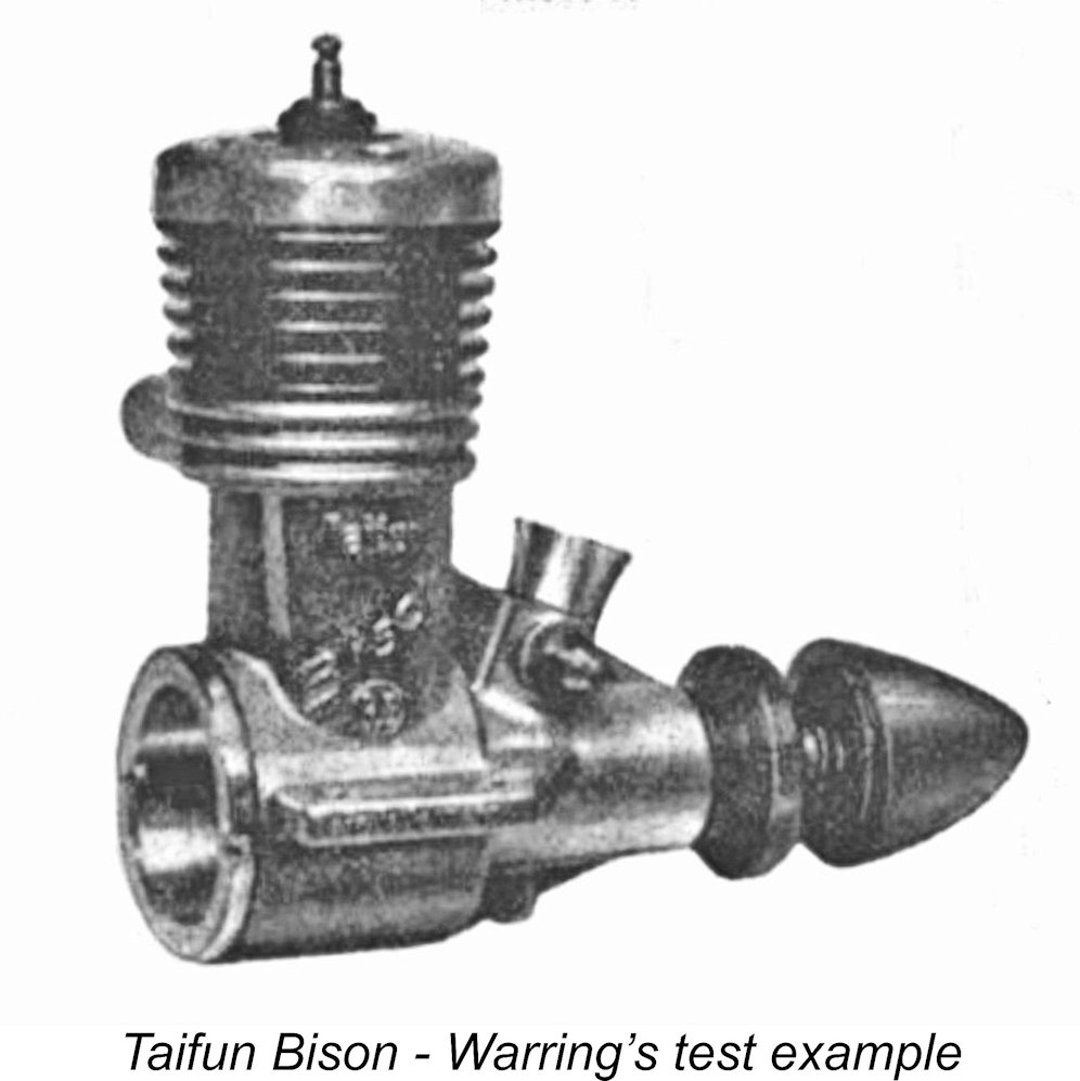 The Bison was the subject of a published test report by Ron Warring which appeared in the June 1961 issue of “Aeromodeller” magazine. Warring was highly complimentary regarding the standard of the engine’s construction, stating that “workmanship throughout is first class, with an excellent piston-cylinder fit”. The Bison was apparently supplied with both an R/C throttle assembly and a conventional venturi insert for control line or free flight applications. Warring tested the engine in both configurations, finding that the installation of the throttle produced “a penalty of 600 RPM at 10,000 RPM and approximately 1,000 RPM at higher speeds”. Presumably to show the engine in its best light, he only reported performance figures for the engine in un-throttled form.