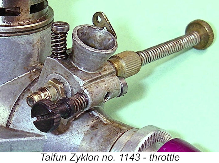 The most unusual feature of the Zyklon was its R/C carburettor, the body of which was cast integrally with the main crankcase/main bearing casting rather than being a separate insert in the more familiar manner. This made it quite clear that the Zyklon was intended from the outset to be used as an R/C powerplant. The designation “2.5 Taifun RC” was cast in relief onto the right-hand side of the upper crankcase, emphasizing this point.