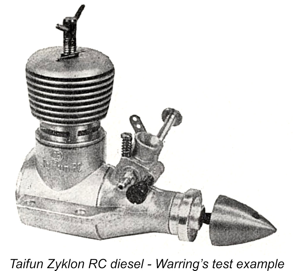 Reverting to the standard un-throttled intake and using a fuel containing 7% nitromethane, Warring reported a peak output of 0.304 BHP @ 13,300 RPM for the engine, which he rightly characterized as a “moderate” performance for an engine of this type and displacement. He reminded his readers that these figures applied to the unthrottled version of the engine, commenting that the throttled version might be expected to give “an appreciably lower performance, particularly at the high speed, and probably peaking at around 11,500 – 12,000 RPM”. Overall, it must be said that this constituted a somewhat lukewarm endorsement of the Bison. It can’t have contributed to much in the way of customer enthusiasm! Despite this, the Bison appears to have remained on offer for some years, implying that it must have attracted a reasonable number of customers. R/C Continues to Dominate – the Taifun Zyklon Diesel