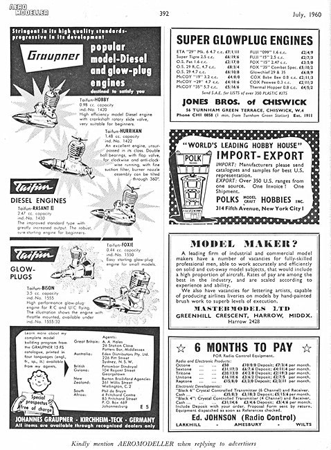 So far, so good, and the manufacture of components for the Foxie commenced, along with the production of a batch of boxes for the engine. Components and boxes for some 250 examples were apparently completed. Graupner actually got as far as including the Foxie in their “Aeromodeller” advertising placement of July 1960 as seen below at the left.