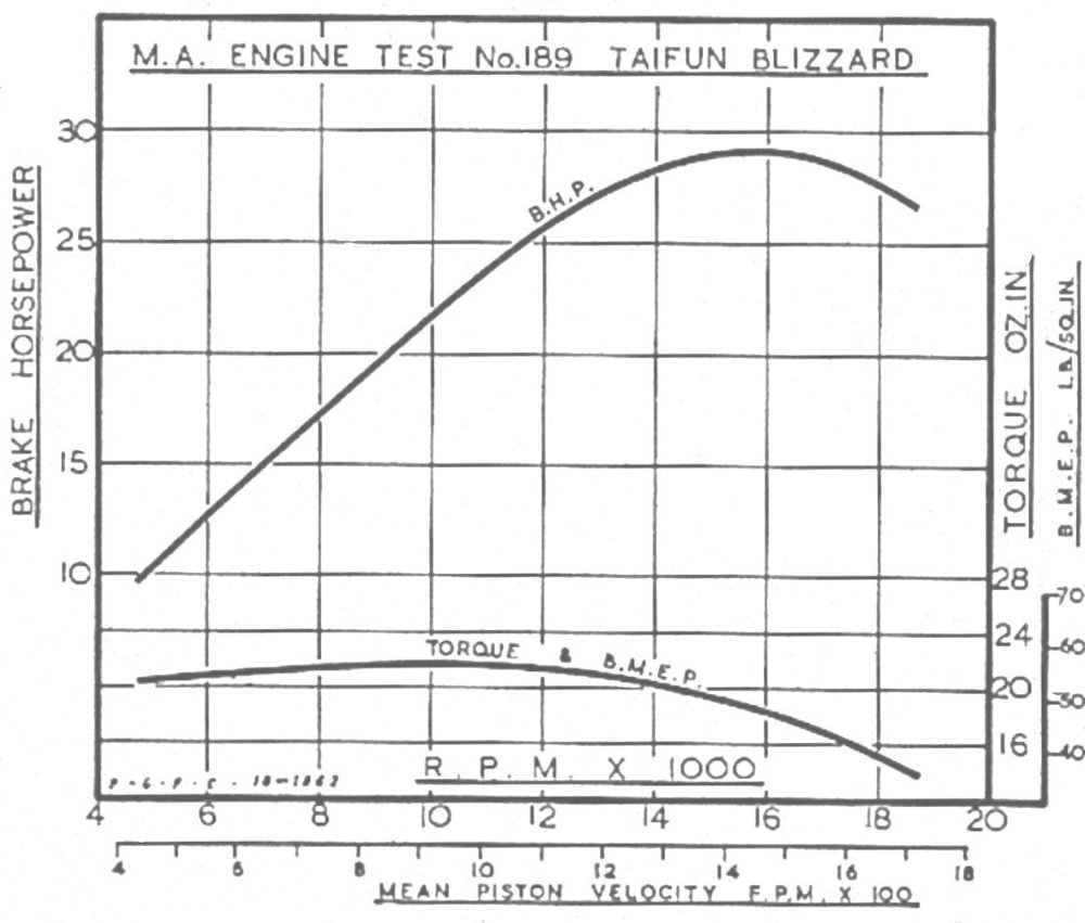 Just out of curiosity, I put my own Blizzard number 1490 into the test stand and gave it a few runs on an APC 8x6 airscrew. This is a used but cosmetically perfect example which is extremely well freed up. The engine proved to be a very easy starter and a superb runner. On the APC 8x6 prop it managed 11,700 RPM, indicating an output of some 0.282 BHP at that speed. This is well in excess of the 0.25 BHP which Chinn's test example developed at the same speed.