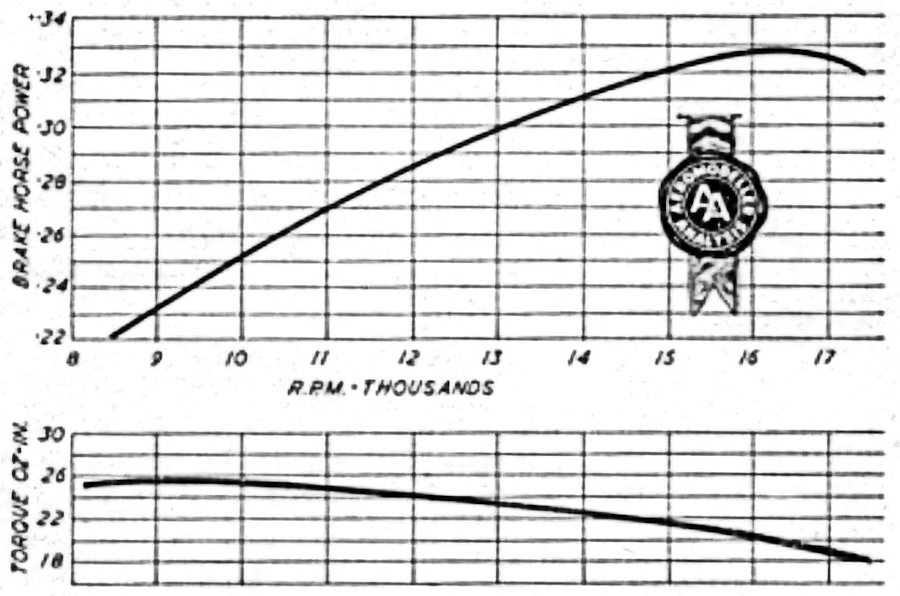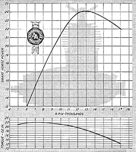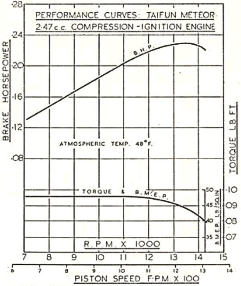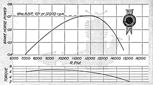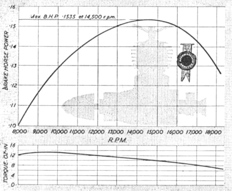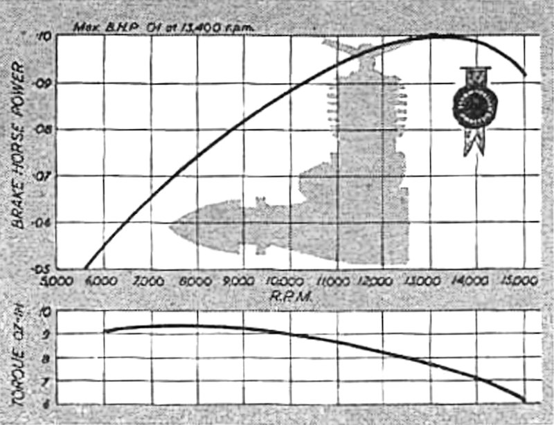 As far as output went, the tester reported a peak of 0.234 BHP @ 13,500 RPM. This fell somewhat short of the manufacturer’s claim of 0.27 BHP @ 14,500 RPM, but the tester felt that a “good” example which was well run in might well approach the claimed figures. A looser contra-piston would probably also have helped in permitting the establishment of an optimized compression setting at any given speed.