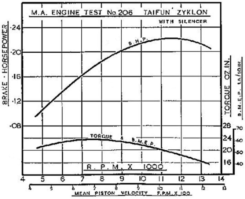 Warring noted that power was “adequate for the job, although rather on the modest side for a modern diesel of this size”. He offset this remark by commenting that with the engine’s modest peaking speed of 12,500 RPM “reasonably large propellers can be used for increased thrust efficiency”. In an R/C context, this is no bad thing. When it came to the operation of the throttle, Warring was rather less complimentary. He commented that despite the thought which had evidently gone into the design of the throttle, “multi-speed performance is strictly limited”. Even with the greatest care in establishing settings, the minimum safe “idling” speed was found to be in the order In terms of ultimate performance, Warring reported an uninspiring peak output of 0.21 BHP @ 12,500 RPM. It’s highly unlikely that this report did much to attract favorable attention to the Zyklon as an R/C powerplant. Despite this, the Zyklon evidently remained in production for some time, becoming the subject of another published test, this time by Peter Chinn, who had now taken over from Ron Warring as the resident engine tester for “Aeromodeller”. Chinn’s report on the Zyklon appeared in the magazine’s August 1965 issue. The main factor which triggered this re-test was the emergence of strict noise control requirements on the part of the Society of Model Aeronautical Engineers (S.M.A.E.), the governing body for British aeromodelling. This led many model engine manufacturers who marketed their products in Britain to develop silencers (aka mufflers) for their engines. Taifun was one of these manufacturers, developing a silencer for the Zyklon. It was primarily to test the effectiveness of this accessory that Chinn conducted his 1965 test. Chinn reprised the description of the engine provided earlier by Warring. He found the engine to be easy to start, with finger-choking alone being the only necessary preliminary. He tried the engine both with and without the silencer, finding that it had very little adverse effect upon performance in the speed range which appeared most appropriate for the engine. His one negative comment was the familiar Taifun complaint that the contra-piston in his In terms of the Zyklon’s throttle response, Chinn had more or less the same experience as Warring before him. He was able to throttle down to 3,500 RPM from a speed of 10,000 RPM, but agreed with Warring that the throttle was best regarded as a two-speed device, with rather indifferent intermediate control. Chinn more or less confirmed Warring’s findings in outright performance terms, finding a peak output of 0.22 BHP @ 11,500 RPM. These figures were obtained with the silencer fitted, whereas Warring had tested the engine in un-muffled form. Despite his various criticisms, Chinn’s summary was generally favourable. He characterized the Zyklon as offering “robust construction, easy handling, a useful power output and adequate throttle control”. He felt that it would be a sound choice for a single-channel operator who needed a reliable two-speed R/C sport engine.
