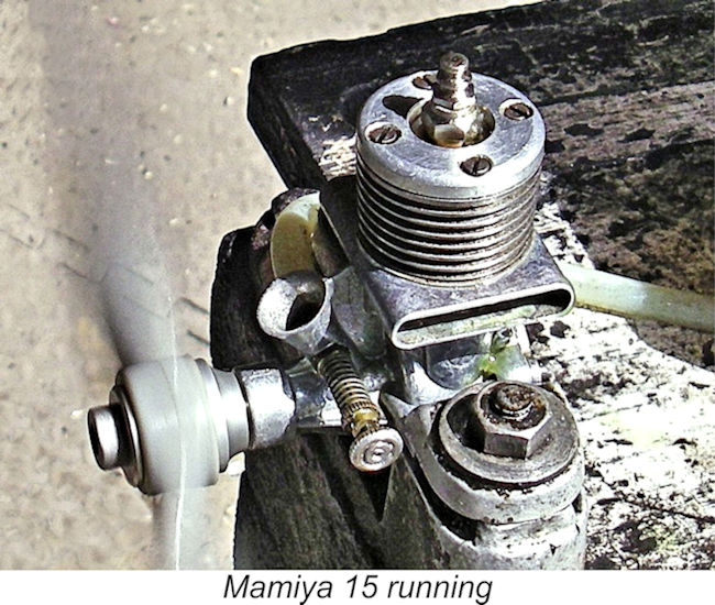 However, the arrangement did impose the usual sawn-port limitation of a relatively long blow-down period and a somewhat restricted transfer period, since no overlap could be provided between the exhaust and transfer ports. In this respect, it represented a step backwards from the earlier cross-flow loop-scavenged designs manufactured by Tokyo Hobbycrafts, which had featured a considerable degree of port overlap. The crown of the turned cast iron piston had a relatively steep-sided conical profile with a central flat area. The con-rod big end was bronze-bushed, while the 8 mm diameter crankshaft also ran in a bronze bushing. It featured a large straight-sided induction port which produced rapid opening and closing of the induction system – I haven’t taken my well-settled example apart to examine its precise shape or method of production. The needle valve was a stubby affair with a knurled brass control disc at its outer end. So much for the engine’s highly individualistic design features – how did all of this ingenuity translate into performance terms? Let’s find out! The Mamiya 15 on Test
