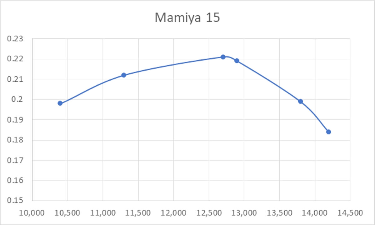 Warring summarized the engine rather politically-incorrectly (by today’s standards) as “a neat “Nip”” which would be “fine for sports flying or ‘open’ contest work”. The engine never appears to have made it outside of Japan in significant numbers, the consequence being that examples are relatively rare today outside their country of origin. The Mamiya 15 Re-Appraised I’ve commented previously that the performance figures recorded by Ron Warring in his various engine test reports generally tended to be a bit on the low side when compared with figures obtained by Peter Chinn of “Model Aircraft” for the same engine. Indeed, my own latter-day test figures tend to surpass those reported by Warring. I have no ready explanation for this – it must be down to differences in testing procedures and engine management. Regardless, there would obviously be value in running my own test of this engine since I had a fine example ready to hand. Speaking objectively on the basis of decades of experience, the engine's design features would lead one to expect a somewhat higher performance than that measured by Warring. However, this is an impression that clearly warrants testing. My example has undoubtedly been mounted and used, but it remains in fine original condition, hence constituting a fully representative test subject. I decided to try the engine on my standard set of 6 test props which I generally use for 2.5 cc non-racing glow-plug motors. The test fuel was a castor-based 15% nitro brew as recommended by the manufacturers. In view of the unusually low compression ratio, an Enya no. 3 (hot) glow-plug was used for this test. A couple of legitimate criticisms of the Mamiya 15 presented themselves immediately. Firstly, I can fully endorse Warring’s comment that the needle valve control is way too close to the prop disc for operator safety, also being very difficult to manipulate due to its unusually short lateral projection from the intake. And secondly, the length of the threaded prop mounting spigot at the front of the shaft is far too short – an 8x6 APC prop could not be fitted I began this test with an APC 8x4 prop fitted, intending to give the engine a little preliminary shake-down running prior to the commencement of the actual test. I'll begin my report by saying that I found absolutely no support for Ron Warring's comment that the Mamiya 15's starting was "not all that brilliant". It wasn't necessarily a consistent first-flick starter, but two or three flicks following an exhaust prime invariably had it going. In way could it be classified as being in the least bit difficult. Why Warring felt the need to resort to an electric starter "to ensure positive results" is quite beyond me! Once running, the plug could be disconnected immediately with little loss of speed, indicating that the compression ratio was at least operationally adequate. The engine's needle valve response was found to be quite positive without being unduly sensitive. As a result, the Mamiya proved to be easy to set, with the proviso that one had to be very careful indeed when manipulating that rather fiddly needle valve. The risk of skinned knuckles was high, while the proximity of the very hot exhaust restricted one's access further. A longer needle valve control would have been appreciated. I put about ten minutes of rich running on the engine to settle it down, and then ran a series of test props. The results are recorded below.
