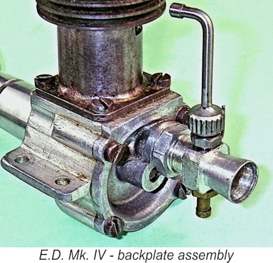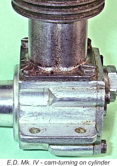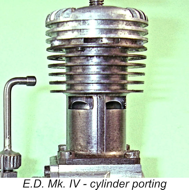 The engine weighed in at a checked 185 gm (6.52 ounces), rather on the hefty side when compared with the competing 118 gm (4.16 ounce) AMCO 3.5 PB. However, experience in the field was to prove the E.D. to be significantly more sturdy and hence more durable than the AMCO, as well as being at least the AMCO’s equal in terms of performance. Although it was a short-stroke engine, the Mk. IV nonetheless had a somewhat “tall” appearance due to its use of an unusually long con-rod. This had the effect of reducing the rod's swing angle and hence the generated side-thrust, although it also increased the crankcase volume. At the top, the cylinder was surmounted by a finned cylinder head which was fully machined from light alloy bar stock. This head was secured to the cylinder using six short machine screws which engaged with tapped 6BA holes in the cylinder’s top flange. The head was centrally drilled and tapped 4BA to accommodate the T-shaped compression screw.