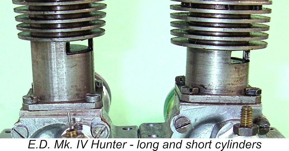 The cam-turning of the lower cylinder to accommodate the internal bypass flutes was omitted, presumably for cost reasons. This resulted in a substantial increase in the wall thickness of the lower cylinder. Both the crankcase and backplate casting were given a bead or vapour-blasted finish, although the front main bearing housing had a turned finish to match the prop-driver and spinner, which were unchanged at this stage. The finned cylinder head also continued in use at this time. The only other change was the use of a longer needle valve control arm. These changes must have been implemented at some point in 1954, since Kevin Richards reported owning engine number 4K 61 4 (October 1954) of this type. However, no evidence of the revised design appeared in any of E.D.’s advertising. The only reference to these revisions that I can find in the contemporary modelling media was Peter Chinn’s comment which appeared in the April 1955 issue of “Model Aircraft” to the effect that the Hunter had then recently been “shortened” by the replacement of the unusually long conrod used prior to that point with the considerably shorter 2.46 cc E.D. Racer component. A few more changes were subsequently introduced along the way. Kevin Richards’ engine number 4M 64 4 (November 1954) displays a considerable reduction in the degree to which the crank-disc was counterbalanced. Kevin’s engine number 4C 160 5 (March 1955) features a revised needle valve assembly which was identical to that used in the contemporary E.D. Racer. As with the con-rod, commonalty of components was increasing – a logical cost control measure. A further change occurred at some later point in time when the finned cylinder head was replaced by a plain un-finned component. Kevin Richards believed that this change probably occurred in 1955 and survived for some years. Certainly, Kevin confirmed that engine number 4J 50 8 (September 1958) featured such a head, but exhibited no other changes. It’s my personal view that the successive changes described above were of themselves insufficient to constitute new variants of the engine. Rather, I’ve chosen to present them as sub-variants of the fourth major variant of the E.D. Mk. IV Hunter - the "short cylinder/long prop driver" version. The E.D. Mk. IV “Hunter” – Fifth E.D. 3.46 cc Variant