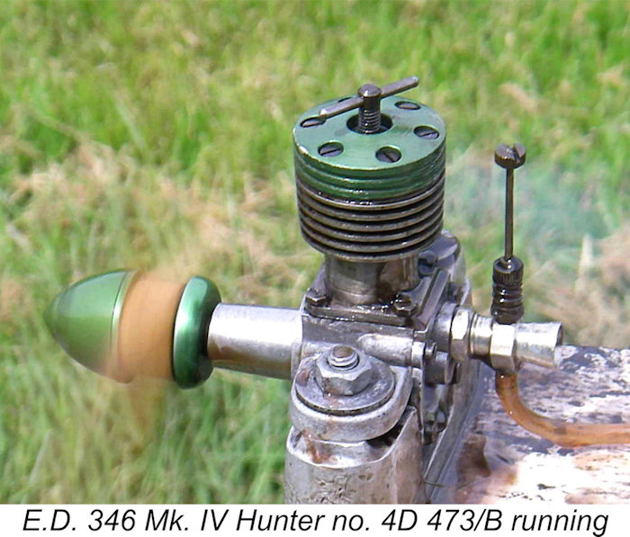 Initially the alloy components were un-anodized – Kevin’s engine number 4N 21/9 (December 1959) is of this type. However, engine number 4N 43/9 from the same December 1959 batch and only 22 units later in the production sequence features a green-anodized head, prop-driver, prop washer and spinner, matching the identical components used in the Mk. I Taplin Twin. The needle valve continued to be the same as that used in the contemporary E.D. Racer. My own two examples of this variant bear the serial numbers 4D 137 B and 4D 473 B, both dating from April 1961. The latter number shows that production of the Hunter was continuing at a quite respectable rate even at this relatively late date. This variant of the Hunter appears to have remained in production or at least on offer right up to April 1962, at which point the disastrous factory fire of April 29th, 1962 severely compromised E.D.’s production capacity, forcing the abandonment of a number of long-established models. Sadly, the Mk. IV Hunter was one of those abandoned designs. The Hunter name was to be resurrected in later years by the successor companies to the original manufacturers, but those offerings bore little resemblance to the classic E.D. Mk. IV of earlier years, merely “borrowing” the Hunter name. As such, I will leave them for separate discussion elsewhere. The E.D. Mk. IV – Promotion and Production History