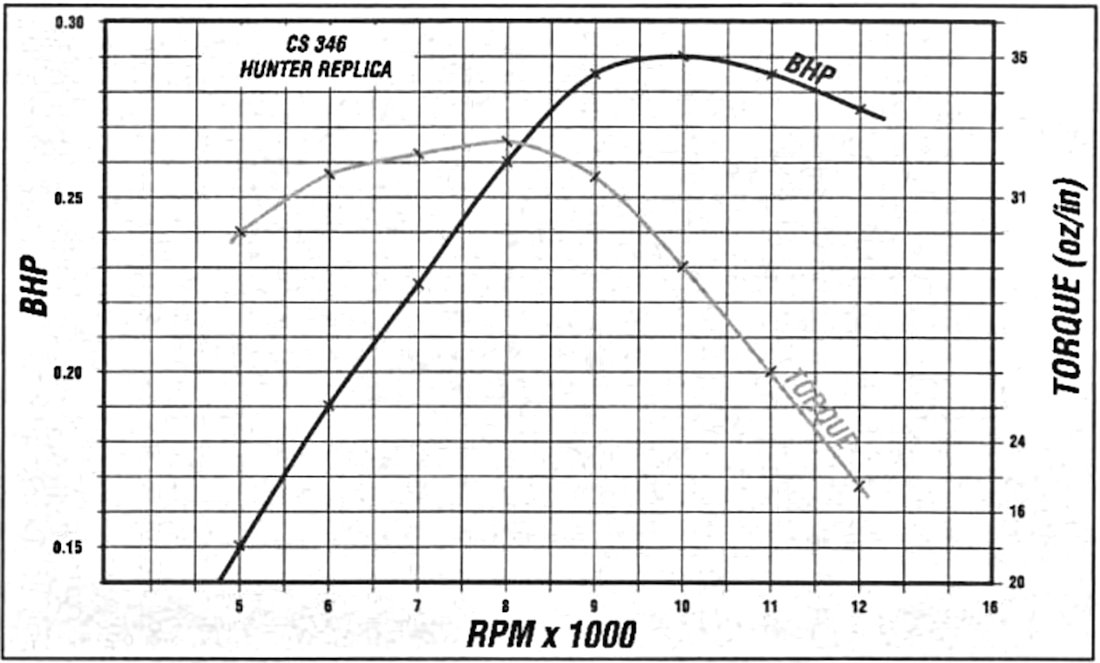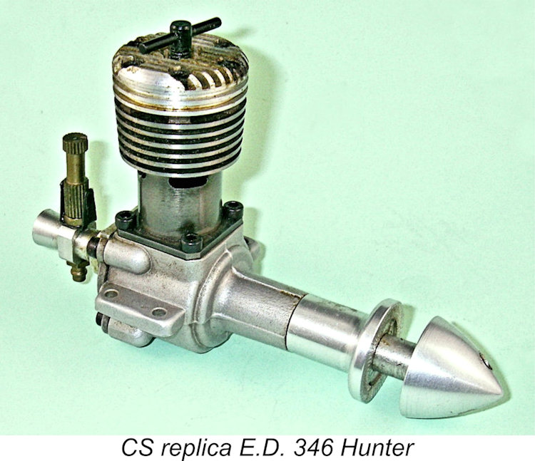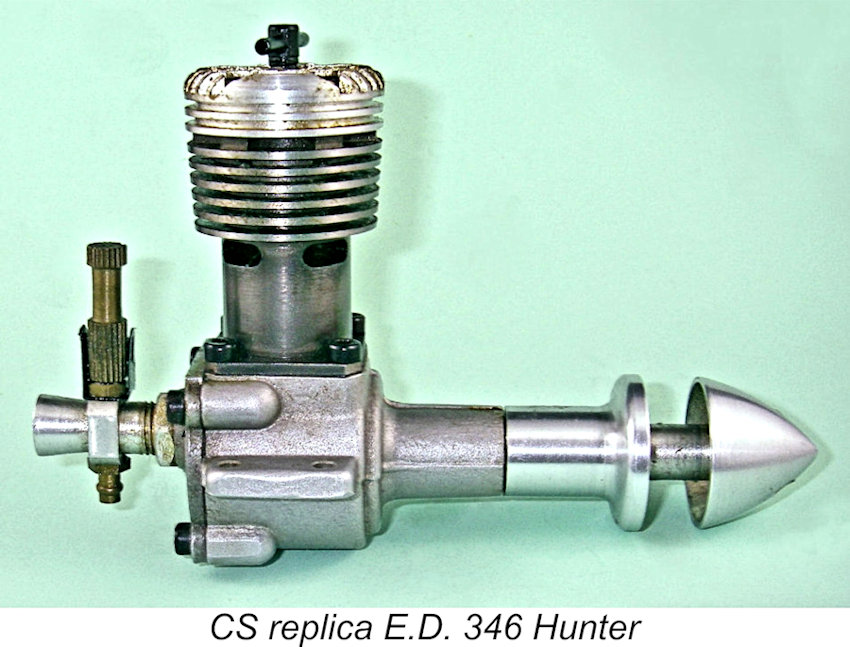 This interest was sufficient to encourage the CS company of Shanghai, China to introduce a near-replica of the engine, which they did in the early 1990’s. The CS rendition of the Mk. IV was a quite faithful replica of the second variant of the E.D. original, being sold as the CS “3.46 E.D. Mk. IV Hunter” replica. It was one of CS’s better efforts, following the original design very closely and sharing both its “tall” dimensions and its finned head. Moreover, most examples displayed a quite acceptable standard of workmanship, although some “fettling” was generally necessary to correct a few manufacturing errors, as usual with CS engines. Once this was done, the engines ran very well. Bore and stroke were "metricized" by being set at nominal dimensions of 16.5 mm and 16 mm respectively for an actual displacement of 3.42 cc - close enough! The major departure from the original E.D. “Three-Forty-Six” was the elimination of the cam-turning on the lower cylinder, although the cylinder was dimensioned to the original height rather than the lower height featured in the fourth and fifth variants of the original. This had the effect of making the lower cylinder considerably thicker in order to accommodate the twin internal bypass/transfer flutes, also adding a little extra weight. The CS replica actually weighed in at a checked 219 gm (7.72 ounces), significantly more than the original E.D. Mk. IV. The needle valve too was one of CS’s standard assemblies rather than a replica of the original. This had a rather skinny spraybar for the intake employed – I found that an original E.D. assembly having a greater spraybar diameter worked far better.