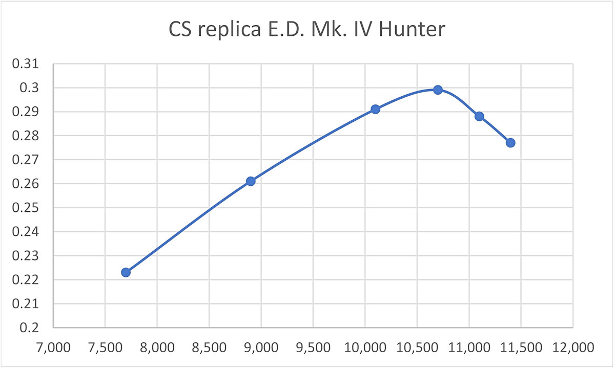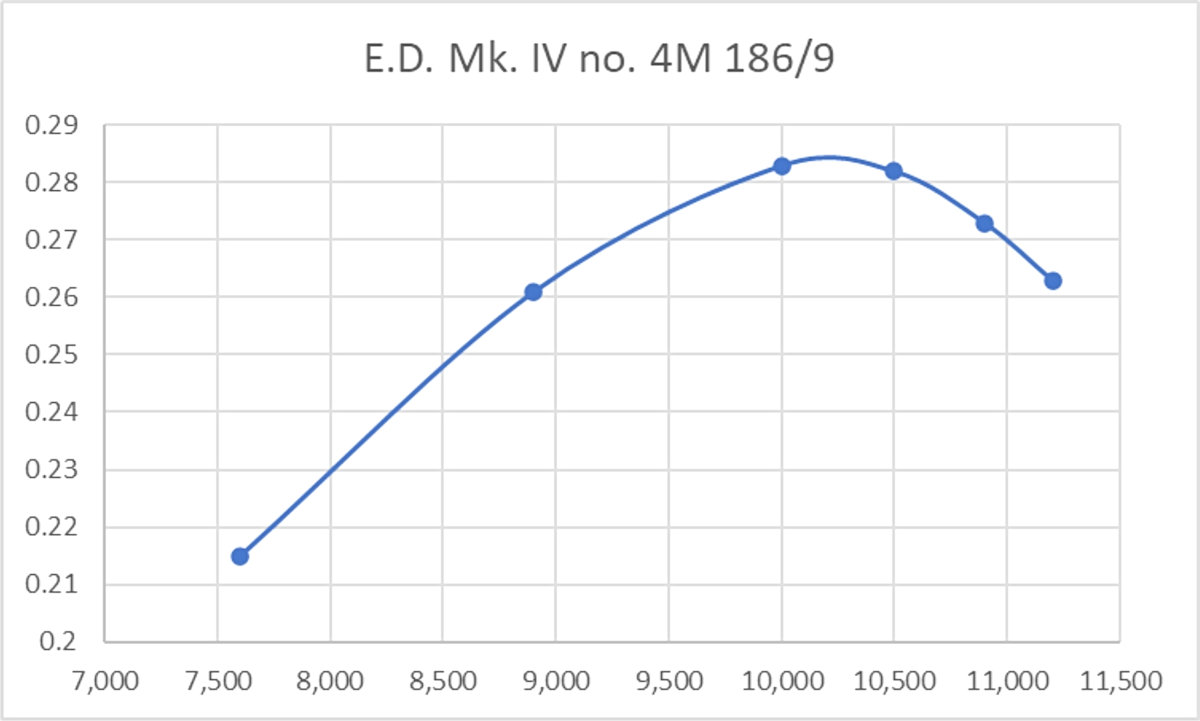 My own experience with this replica fully supports Richard Herbert’s findings. My example always gave the impression of performing at a somewhat higher level than any of my original examples of the second variant of the E.D. Mk. IV on which the CS replica was based. To test this impression, I put my CS replica into the test stand at the same session at which I tested the first and fifth variants, as reported earlier. It started and handled just as well as the two original E.D. units, also performing very strongly. Running the same suite of test props and using the same fuel, I recorded the following data: