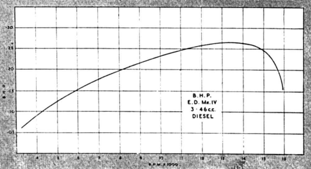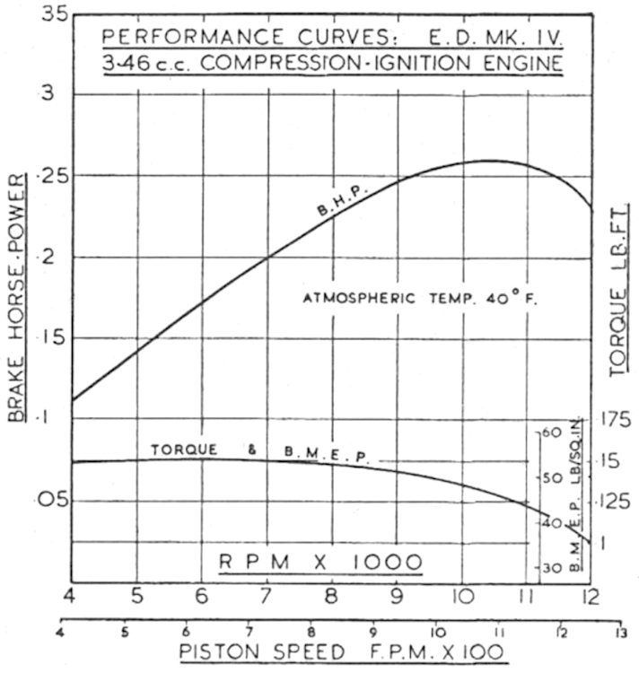 The first test of the engine to appear was Lawrence Sparey’s report which was featured in the March 1950 issue of “Aeromodeller” magazine. An amusing observation with respect to this test is the fact that the image of Sparey’s test engine was Sparey was very impressed with the engine, characterizing it as being “noteworthy for its high power output, easy handling and consistent running qualities”, with no mechanical issues arising during the test. He reported a peak output of 0.265 BHP @ 13,500 RPM, which he noted as being in excess of the manufacturer’s claimed output of 0.25 BHP.