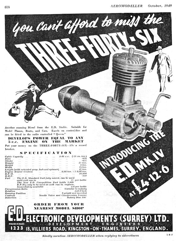 My friend and fellow researcher Marcus Tidmarsh has pointed out that the engines produced by E.D. seem to have fallen into two categories – those in effect designed “in house” by E.D. staff and those designed primarily by an outside consultant. Charlie Cray seems to have been an E.D. employee, while Kevin Richards’ in-depth research has shown that Basil Miles was never an E.D. employee or official at any time. His design work for the company must therefore have been carried out on some kind of a contractual or royalty basis. Accordingly, it appears that the design rights to the early E.D. models designed at least in part by Charlie Cray remained with the company, since the engines were nominally designed by their employee(s). Miles may well have had input to the Mk. III with its rotary valve induction system, but any such work would have been undertaken in the capacity of an outside advisor – E.D. would have retained ownership of the designs. However, this changed as E.D. seemingly began to turn increasingly to Miles to guide the development of their later designs. At some stage, the relationship between Miles and E.D. appears to have developed to the point at which the ownership of the new designs remained with Miles rather than being transferred to E.D. It’s a little unclear exactly when this arrangement took effect. The design of the 1 cc E.D. Bee Mk. I Series 1 diesel of mid 1948 certainly bears a strong imprint of Miles’ design style, but his name was never cited as the designer of that model, nor as far as I’m aware did Miles ever lay claim to that design. However, the September 1949 appearance of my central subject, the E.D. Mk. IV “Three-Forty-Six” is another matter entirely. Although Miles’ name was never mentioned by E.D. in connection with this engine, it seems all but certain that he was actually the primary designer of the Mk. IV. He is seen in the accompanying image testing one of these engines. If the “Three-Forty-Six” design did indeed originate with Basil, as seems very likely, then he would have retained ownership of Miles reportedly went so far as to remind Ken Day that the Hunter was his design, apparently producing documentary evidence to support this claim. Under the terms confirmed in these documents, any design changes had to be approved by Basil, and no such approval had been sought. At Basil’s insistence, Alan Greenfield became involved at this point to oversee the finalization of the two designs to Basil’s requirements. It appears to me at least that Ken Day's E.D. company effectively brought this criticism upon themselves. The design of the Super Hunter was so different from Basil Miles' original E.D. Hunter design that it was actually a completely original design as opposed to a derivative. If it had been released by some other name as an all-new model, it's difficult to see how Miles could have intervened to the extent that he did. Presumably Day & Co. wished to draw upon the nostalgic cachet attached to the Hunter name, but in doing so they opened the door to Miles' intervention.