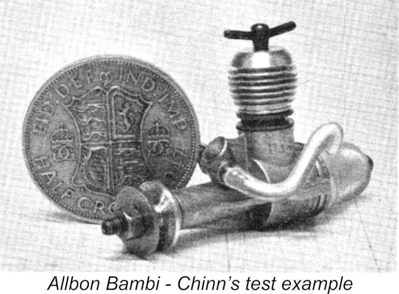 The dimensioned three-views which accompanied this review clearly showed a 3/16 in. dia. boss protruding from the centre of the plain un-knurled prop driver - a feature which was apparently confined to early examples of the engines. In addition, the example tested by Chinn appears to have a plain un-anodized cooling jacket. These features are undoubtedly indicative of the test engine's very early position in the Bambi's production sequence, since almost all regular production models featured red-anodized cooling jackets. Unusually, Chinn refrained from publishing a full power curve, confining himself to an estimate of an output of perhaps 0.010 BHP @ 12,000 rpm. The point was emphasized that both Chinn and the manufacturers were in agreement that the Bambi was not an engine for a beginner.