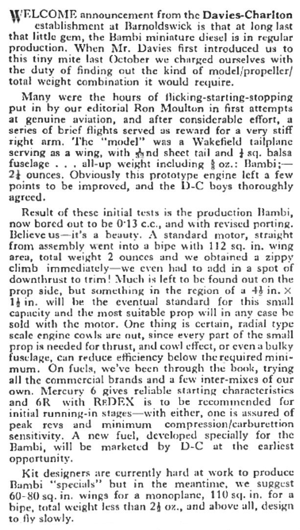 The review noted the development progression from 0.10 cc to 0.15 cc as Chinn had done earlier. It also included Warring’s recommended starting procedure as outlined previously. In an admirable example of typical British understatement, Warring noted that "...we would hesitate to recommend a Bambi for a relatively inexperienced modeller..".