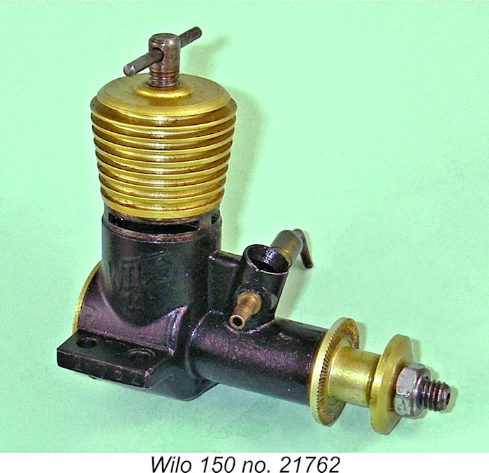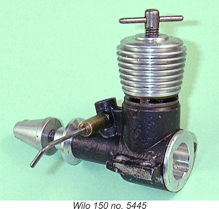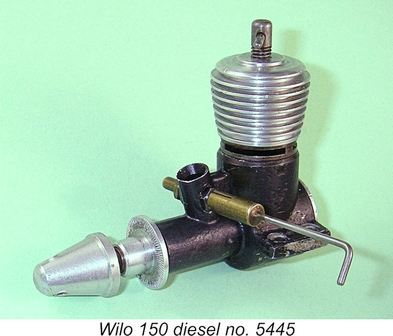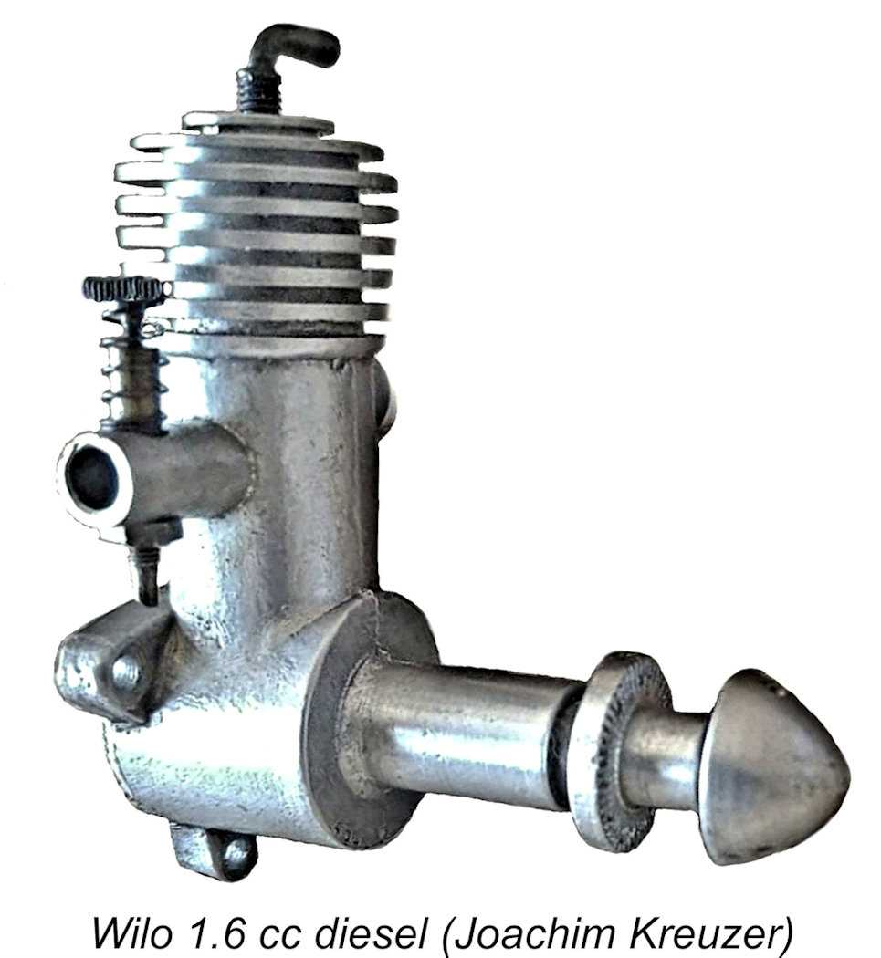 The previously-mentioned Wilo 3.5 cc diesel of 1943 seems to have been manufactured by Willi Otto himself in a small series. However, the first Wilo models to be put into series production after WW2 were evidently the Wilo 1.6 cc and 3.5 cc sideport diesels which were manufactured for Willi Otto by MODELLKRAFT in East Berlin. These units bore a strong resemblance to the early Czech Atom models. The 1.6 cc version featured bore and stroke dimensions of 12 mm and 14 mm respectively for a nominal displacement of 1.583 cc. Weight without tank was cited as a remarkably light 80 gm (2.82 ounces). Claimed output was 0.118 BHP @ 9,000 RPM.