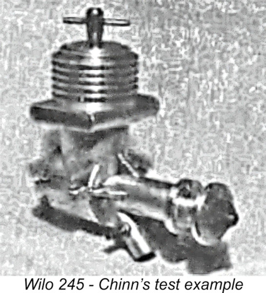 Chinn followed this up with a more comprehensive look at German model engine production which appeared in the April 1954 issue of MAN under the title “Boom in German Engines”. This article included the attached table (left) providing details of all of the German engines known to have been in production during 1953/54. The Wilo “Boy” and “Fox” appeared in this table, but the 2.47 cc “Pony” was absent, evidently having been supplanted by the 2.45 cc front disc valve model. Chinn stated specifically that the 245 was a more recent production.
