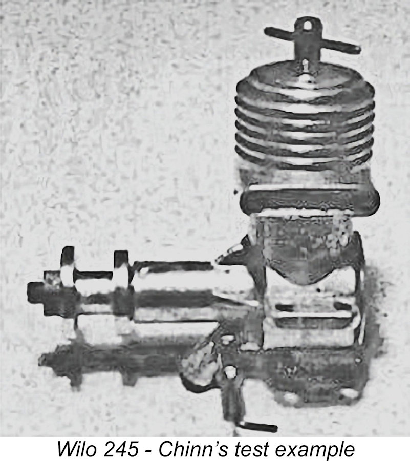 Chinn found the Wilo’s starting to be “quite good” and its operational flexibility as “exceptionally good”. Using a “light” 10x5 airscrew, which the engine reportedly turned at 9,300 RPM, he was able to throttle the Wilo down to only 2,500 RPM using the needle and comp screw. The latter control came in for some criticism – Chinn found that the contra-piston tended to freeze in the bore when hot, a situation which was not alleviated by a comp screw which became uncomfortably hot and was fitted with a tommy bar which was too thin. Chinn’s comments are about as close as I can come to presenting a test of this very unusual engine. The Wilo 245 was clearly still in production as of early 1955, since it was included in Chinn’s “International Engine Review” which appeared in the April 1955 issue of “Model Aircraft”. However, the Wilo range dropped below the Western media radar at that point, not to re-appear until the early 1960’s. Production of the Wilo 245 evidently ended at some indeterminate point in the mid to late 1950’s.