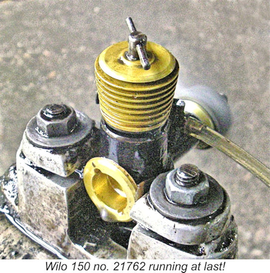 Looks as if I missed one or two settings, but the general picture is clear enough. This example of the Wilo 150 seemed to deliver a peak output of around 0.126 BHP @ 12,000 RPM, figures which are not at all inconsistent with those cited on the M.E.C.A. Region 16 website. However, there's no support here for the Then it was the turn of gold-headed Wilo 150 no. 21762 seen at the left. This is clearly a later rendition of the engine - the serial number confirms that. This example appears to be essentially unrun - it has certainly never been mounted. Accordingly, I felt that a little running-in time would be appropriate prior to taking any speed readings. I will admit to having had a very difficult time getting to grips with this engine. Try as I would, for some reason I simply could not get the thing to start! After over 65 years of diesel wrangling, few ether-burners can resist my attentions for long, but this one did! It would pop and bang once in a while, but simply refused to pick up and run. After an extended period of flicking, my arm was practically dropping off, my back was aching, my stress levels were well into the danger zone and I was getting nowhere. In the interests of self-preservation, I gave up at that point in total frustration. I subsequently checked the engine over in my workshop, finding nothing wrong. The needle valve was clear, correctly aligned and functioning perfectly. An immersion test confirmed that there were no base leaks. Choked suction was perfect and the transfers popped in a healthy fashion when the engine was turned over. Compression seal was excellent. The fuel was good - I had used it successfully to test the other engine at the same session. I was at a complete loss..............