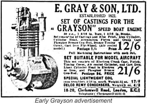 According to Dr. Nichol, the company began advertising its model engine casting sets in 1930-31, at which time they were characterizing their 30 cc offering as the “Grayson speed boat engine”. This implied that the engine’s primary anticipated use was powering tethered hydroplanes in the 30 cc class, then the Blue Riband category in that genre, in which four-stroke engines and flash steam powerplants predominated. The "standard" castings were formed of aluminium alloy, but a set of lightweight castings was also offered in elektron alloy (a very lightweight magnesium alloy), creating a variant said to be “suitable for model aircraft”. Clearly, they built model airplanes BIG in those days!