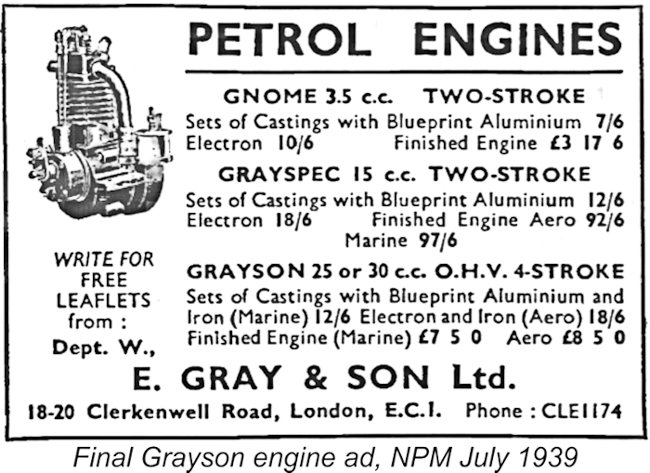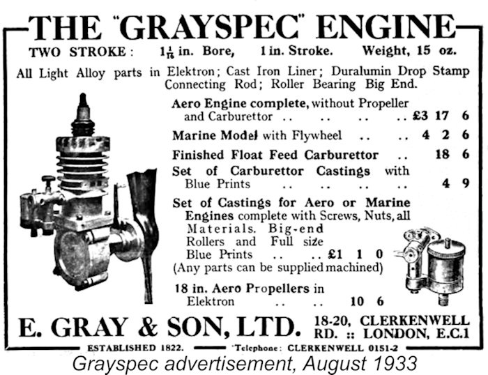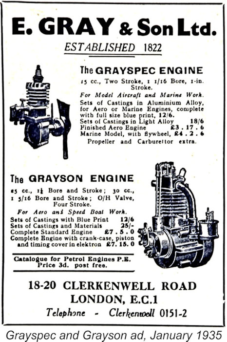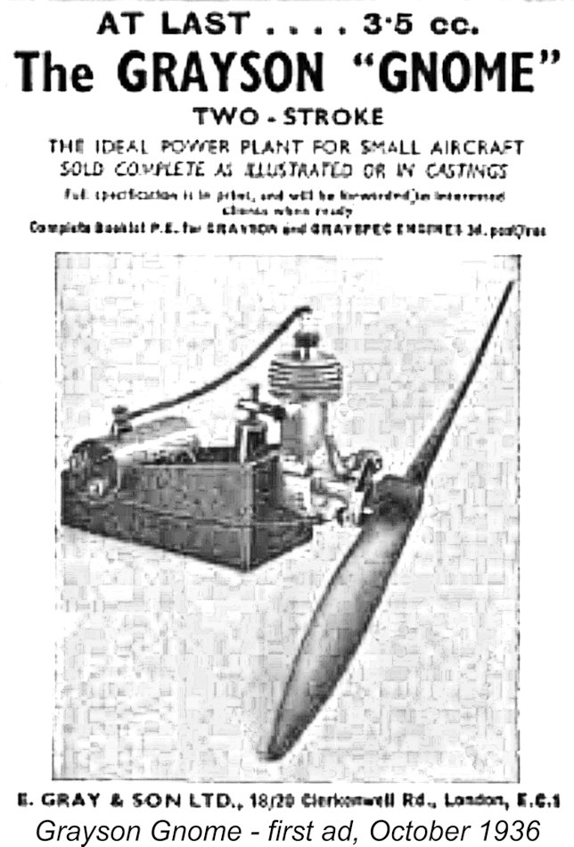 Forgotten Pioneers - the Grayson Engines In this article, I’ll present a little information on a mostly-forgotten range of pioneering model engines manufactured in London, England during the 1930’s by a long-established firm of toolmakers named E. Gray & Son Ltd. of Clerkenwell Road. Founded way back in 1822, over 100 years before it made its first model engine, this company apparently started out as a supplier of tools, accessories and components to the watch-making and clock-making trades, By the time of which we’re speaking here, E. Gray & Son had become well-established as leading suppliers to the model engineering community. The level of British participation in this hobby was then far higher than it is today - a surprising number of model enthusiasts possessed some basic metalworking equipment such as a small lathe, or had access to such equipment through their places of work. The prevailing level of British involvement in model engineering was sufficient to support the publication of a magazine devoted exclusively to the activities of its practitioners. At the time of which we are speaking, this magazine was entitled “Model Engineer & Practical Electrician”, later shortened to just “Model Engineer” (ME). Established in 1898 by its publisher Percival Marshall, the magazine is still in publication today (2025) under the title “Model Engineer & Workshop”, albeit now owned by Mortons Media Group. The ready availability of low-cost machine tools from China and Taiwan has triggered something of a latter-day resurgence in this long-established hobby. “Model Engineer & Practical Electrician” magazine was joined in October 1933 by a rival publication entitled “Newnes Practical Mechanics” (NPM) which was published by George Newnes Ltd. Although this magazine dealt with a very wide range of do-it-yourself projects, it included quite extensive coverage of both model engineering and the development of the pioneering power aeromodelling movement in Britain. Indeed, it was the best available source of aeromodelling infomation during its first couple of years - "Aeromodeller" magazine did not commence publication until November 1935.