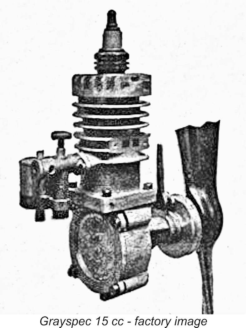 The Grayspec engine was basically a standard two-stroke sideport spark ignition engine of a type that was to become very familiar. It featured an open-frame timer. With a bore of 1.0625 in. (26.99 mm) and a stroke of 1.00 in. (25.40 mm), it was a short-stroke engine having an actual displacement of 14.53 cc (0.887 cuin.). It weighed in at a not unreasonable 16 ounces minus the ignition support system (typically around 4 ounces at the time in question). Initially, all light alloy castings were formed in elektron alloy, underscoring the evident expectation that the engine would be used primarily in aero service, hence encouraging minimum weight. The conrod was a drop forging in aluminium alloy. The elektron cylinder jacket enclosed a cast iron liner. The domed light alloy piston was fitted with a single ring. At some point, the material of the castings was switched from elektron to aluminium alloy. Reportedly, examples built around aluminium alloy castings as opposed to elektron are somewhat more commonly encountered today. This suggests that the change to aluminium castings was made fairly early on.