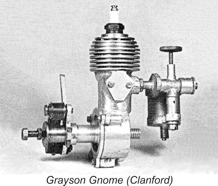 Sets of castings, materials and blueprints were also available at a price of £1 1s 0d (£1.05) for both aero and marine engines, with castings and blueprints for the carburettor also available at 4s 9d (£0.24). A presumably matching 18 in. dia. airscrew cast in elektron alloy was also available at a price of 10s 6d (£0.53). Clearly, this was not a high-speed engine! The Grayson OHV four-stroke model continued in concurrent production at this time, still being offered in displacements of 25 cc and 30 cc and remaining available in both “standard” form with aluminium alloy castings and a “lightweight” version with elektron castings. The “standard” engine with aluminium alloy casings was offered at £7 5s 0d (£7.25), with the lightweight version based on elektron castings selling for £7 15s 0d (£7.75). A basic set of castings and blueprints was available for 12s 6d (£0.63), while for a price of £1 5s 0d (£1.25) one could buy a complete kit comprising castings, materials and blueprints. Both models were still being advertised at the same prices as of 1935. However, as 1936 approached, British model engine manufacturers had come to appreciate the fact that many prospective aeromodelling customers were put off by the challenge of constructing, transporting and storing the very large models needed to accommodate the Grayson, Jones and Grayspec aero offerings. The advent of smaller motors like the enormously influential 0.359 cuin. (5.88 cc) Baby Cyclone from 1935 America had Hallam & Son had reacted promptly to this market trend by bringing out their 6 cc Nipper in late 1935. Gray & Son were a little slower to react to the situation, but they eventually did so by introducing a 3.5 cc two-stroke model called the Grayson Gnome in Unfortunately, the Gnome does not appear to have been a commercial success. Its appearance was evidently overshadowed by the simultaneous April 1937 introduction of both the 3 cc Hallam Baby (essentially a down-scaled rendition of the Nipper) and the 2.31 cc Rogers & Geary Spitfire (basically a scaled-down Baby Cyclone). The Gnome continued to be advertised along with the other Grayson models on a somewhat sporadic basis almost right up to the onset of WW2, but I suspect that by that time the company had lost interest in pursuing its model engine production activities and was simply attempting to liquidate existing stock, actual manufacturing probably having ceased quite a bit earlier.