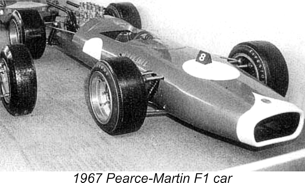 The Martin V8 engine did see some action on the track in 1966 and 1967 when the London-based wheel manufacturer J. A. Pearce collaborated with Charles Lucas to create a very short series of F1 cars based on a modified Lotus 35 Formula 2 chassis with a Martin V8 engine somehow shoehorned in. Only three of these cars were built. They had a somewhat chequered career. One of them placed third at Mallory Park in the rain on Boxing Day 1966 driven by Roy Pike, and was then entered for the 1967 Race of Champions, to be driven by Piers Courage. It was quite slow in practise and then bent a rocker while the engine was being warmed-up on race morning and consequently non-started. Courage then crashed it heavily while testing at Snetterton and Lucas seized the excuse to drop the project to concentrate on manufacturing F3 Titans.