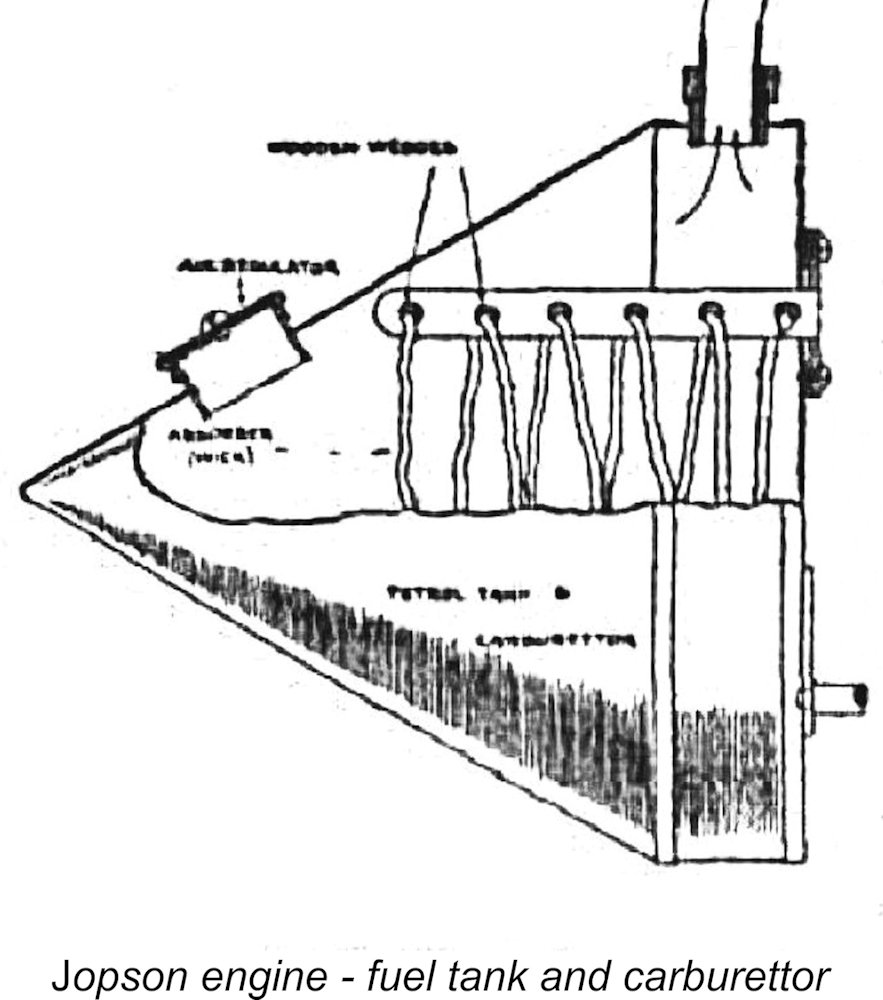 The spark plugs used with this engine were characterized by George Brent as being especially light and simple, reportedly giving very little trouble. Such small plugs were available commercially from Gamages and perhaps elsewhere, but it’s equally possible that Jopson made them himself. David Stanger certainly had to make the plugs that he used in his engines – it’s quite likely that Jopson did the same.