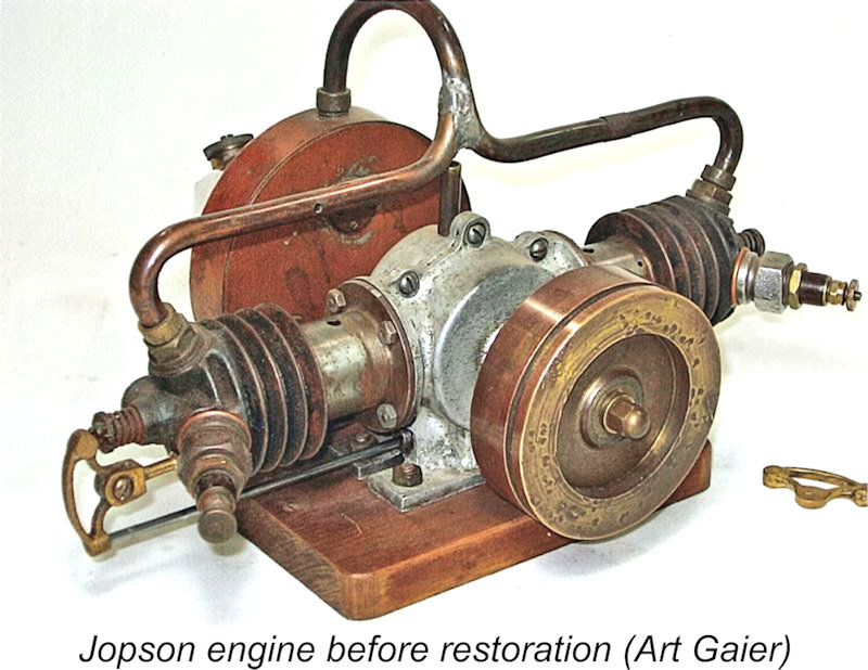 When Art Gaier first received the Jopson, it was missing a number of components and generally looked pretty old and worn. Art’s immediate difficulty was to obtain details of those missing components and their assembly. After spending a considerable amount of time searching the Internet and talking to various people, he finally made contact with the owner of another Jopson motor in England and started a conversation with him.