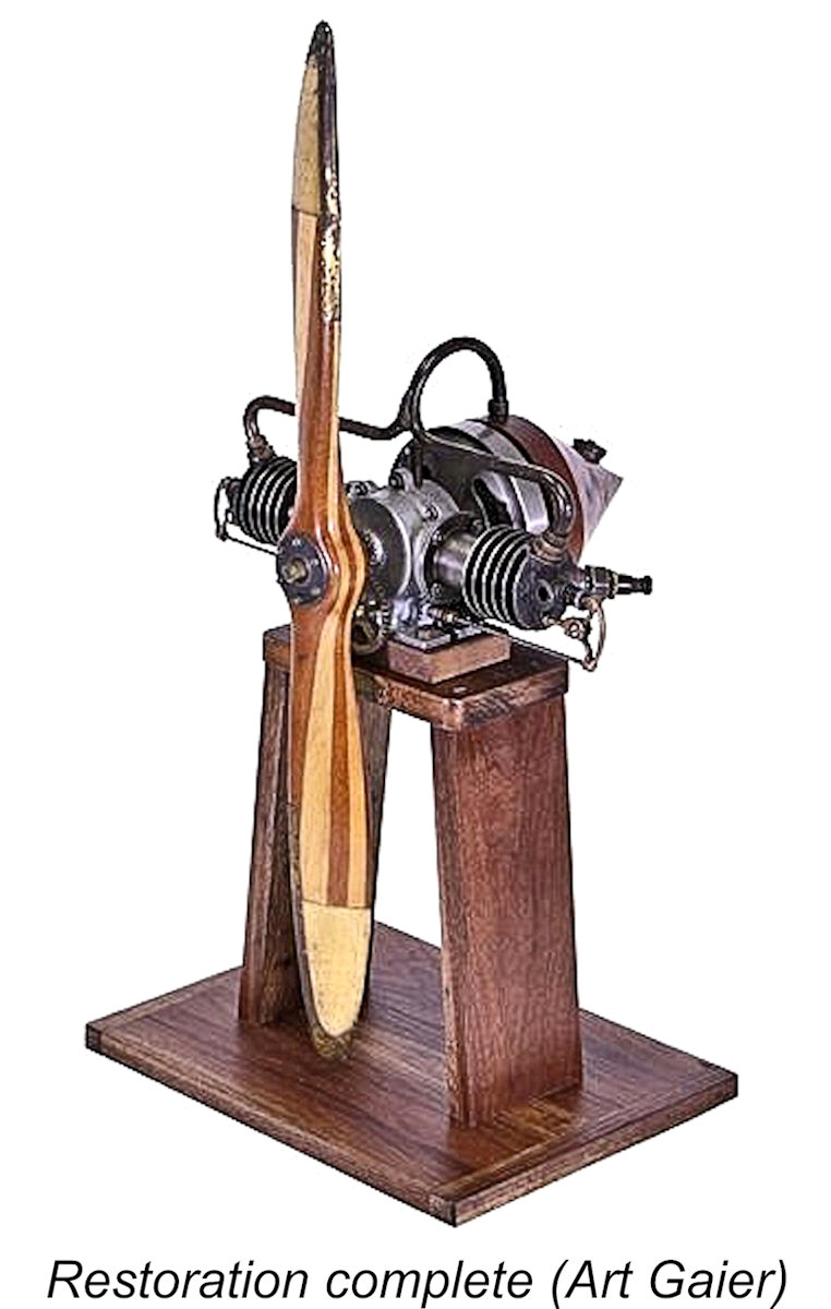 It turned out that between the two of them they had a full set of parts for one complete engine, thus having details and dimensions of all of the engine’s components. This being the case, they were able to provide measurements, photographs and drawings of missing parts to each other. The information provided in the previously-cited 1912 and 1916 publications by George Brent and G. A. Cavanagh respectively was also extremely helpful. I have no information regarding the outcome of the presumed English restoration of one of these engines. However, upon completion of his restoration, Art Gaier very generously made his restored example available to the AMA for display in their museum in Muncie, Indiana on a long-term loan basis. It is this example which appears in the majority of the accompanying illustrations. Art’s restoration is a truly superb piece of work which looks as if it’s all ready to run! It serves as a fitting tribute to the efforts of one of power aeromodelling’s true pioneers! ____________________ Article © Adrian C. Duncan, Coquitlam, British Columbia, Canada First published March 2026