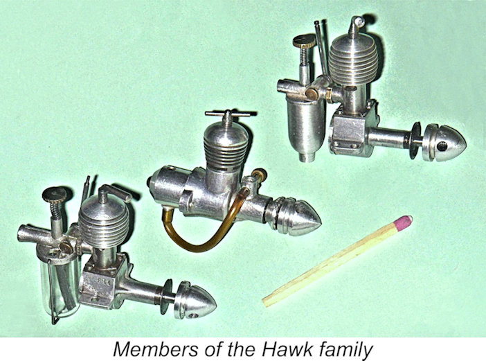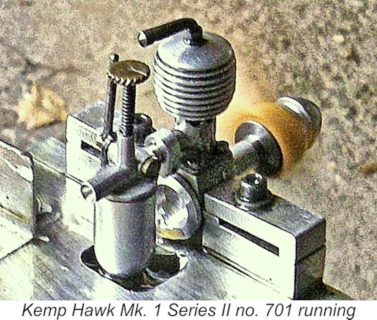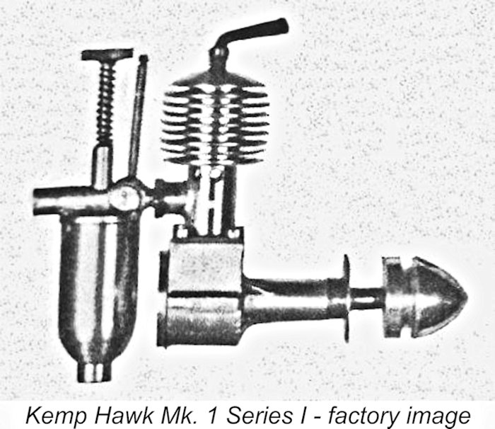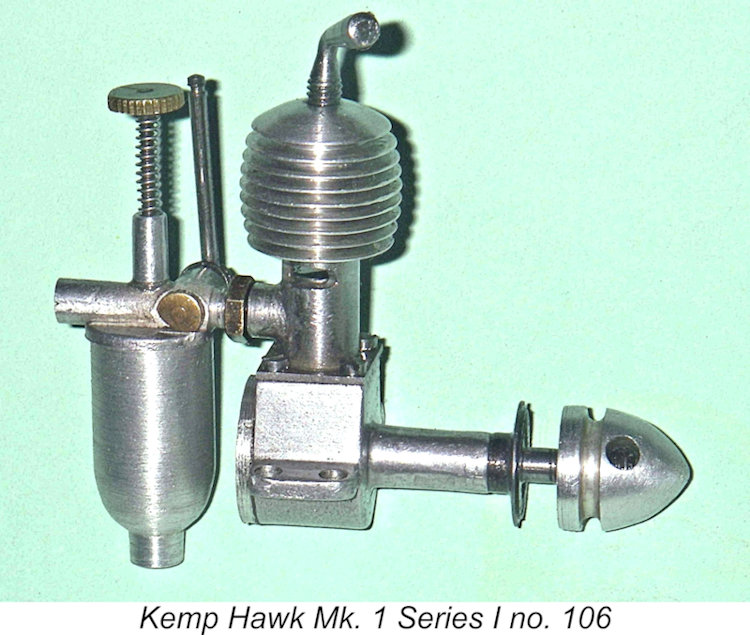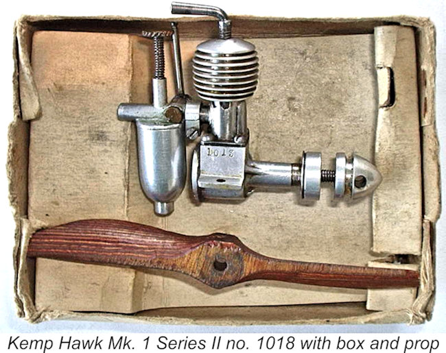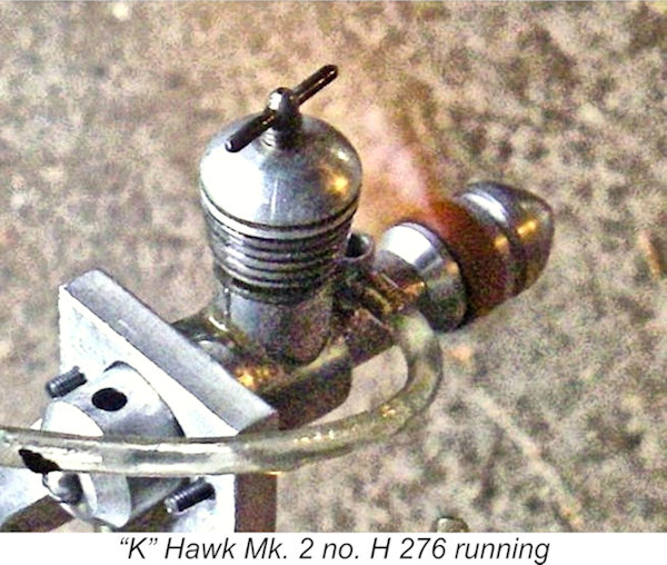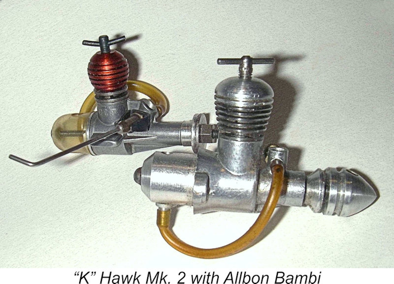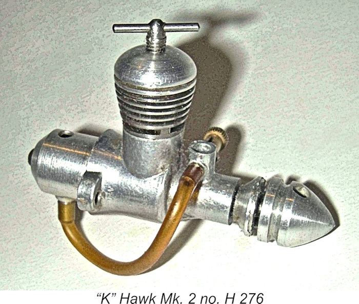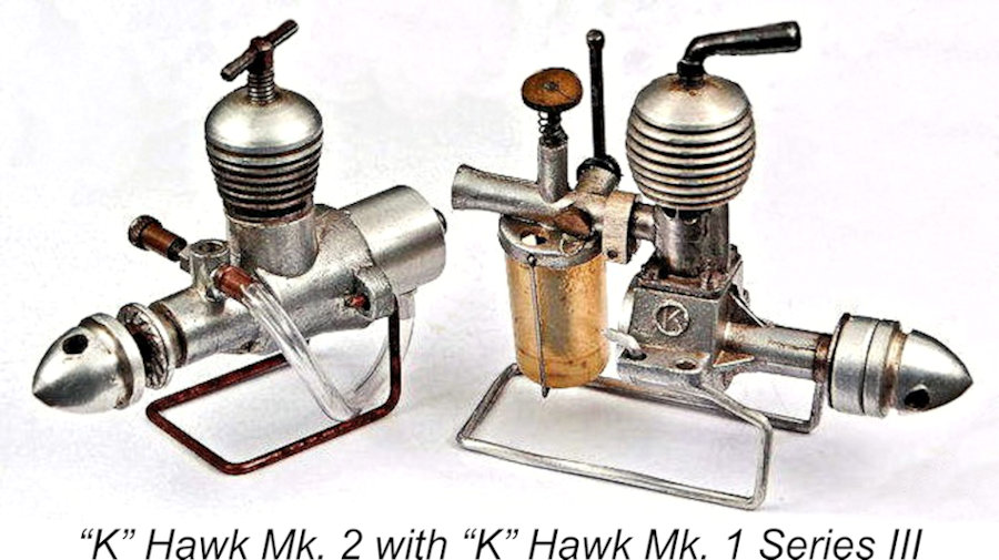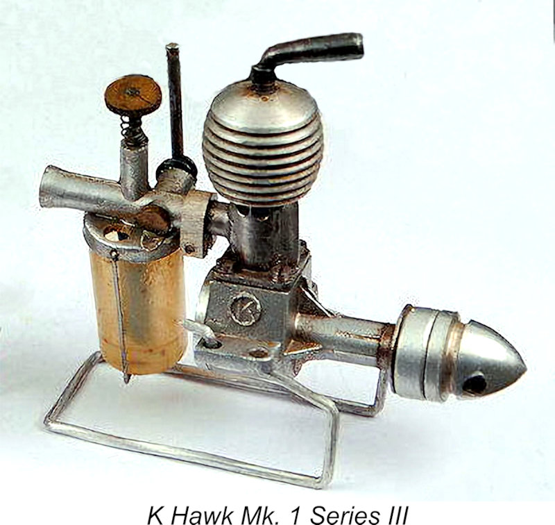 The Mk. 1 Series III version of the sideport Hawk seems to have survived in production for some time following the mid-1948 take-over by the "K" Model Engineering Co. However, the engine had disappeared from the manufacturer's advertising by December of 1948 and in May 1949 we find the company announcing a completely revised Mk. 2 model of the Hawk which used radial mounting in conjunction with front rotary valve (FRV) induction.