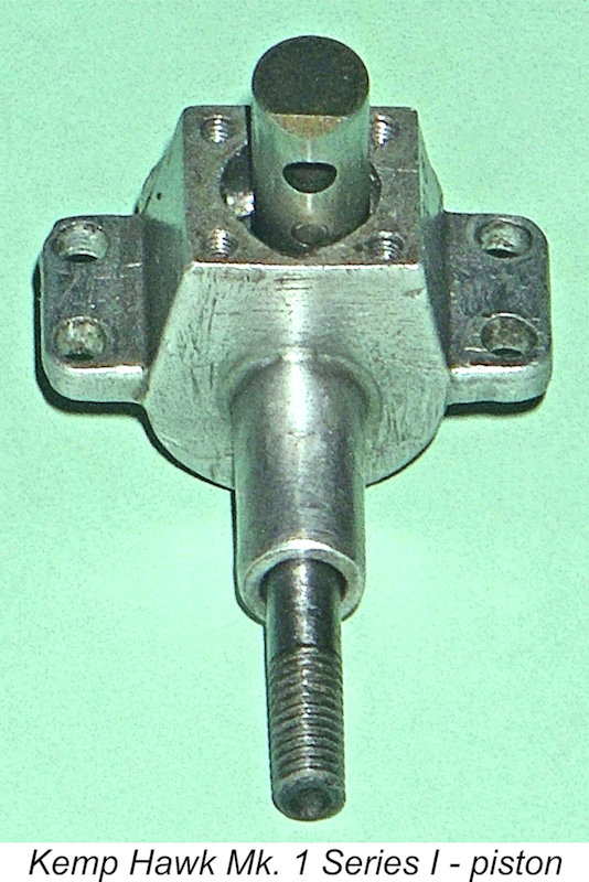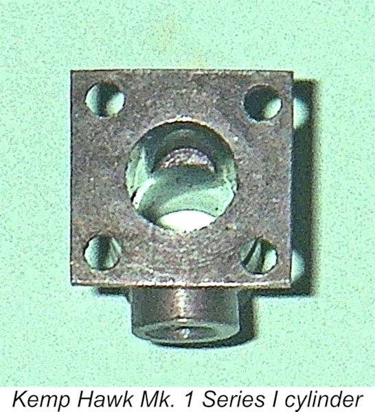 The increase in the bore of the Hawk is a matter which somehow appears to have escaped earlier commentary. Reading between the lines, we may reasonably surmise that experience had shown that the power delivered by the original 0.2 cc Hawk was a bit on the marginal side for practical purposes. It seems likely that customer feedback had indicated the desirability of raising the output somehow, and increasing the displacement was the most obvious means of accomplishing this if it could be managed within the established design parameters for the engine, in particular its external dimensions. For cost control reasons, there were clear advantages in retaining as many of the existing components as possible. The simplest approach would obviously be to bore out the existing cylinder, leaving everything else unchanged. In this context, Harold Kemp evidently took note of the fairly thick cylinder (relatively speaking) which had been forced upon him by the use of the internal bypass passage featured in the first model of the Hawk. He took the decision to increase the bore by a matter of around 0.031 in. to a nominal diameter of 0.250 in. This still left an adequate cylinder wall thickness (for this tiny engine) of some 0.031 in. Eric Offen very kindly took measurements from his illustrated example of the Mk. 1 Series II Hawk no. 1018, obtaining bore and stroke dimensions of 0.252 in. and 0.312 in. respectively. This is close enough for confirmation purposes, considering the fact that the engine may well have been rebored at some stage of its life. Eric's example retained its original box and high-pitch 4 in. dia. wood airscrew with which it was supplied. So far so good, but there was no longer sufficient wall thickness to accommodate the internal bypass formerly used. To get around this, the transfer port was now cut right through the cylinder wall at the front. This port was supplied through a soldered-on external bypass passage similar to that used by E.D. in their contemporary 2 cc models. Apart from allowing the use of the increased bore, this was clearly a far simpler production job, beside seemingly being amenable to increased efficiency in operation. Since the piston port used in the Series I variant was no longer necessary, it was naturally omitted.