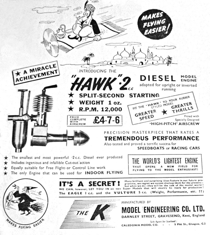 The precise introductory date of the Hawk has been the subject of some debate. However, the evidence appears to be pretty clear. Model shop advertisements in the December 1947 and January 1948 issues of “Aeromodeller” make no mention of the Kemp 0.2 cc model, which they surely would have done if such a novel design had been made available in time for the 1947 Christmas rush.