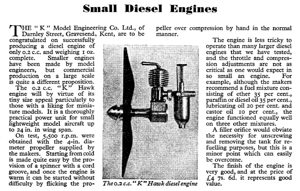 Although the tested unit was undoubtedly a 0.251 cc Series II model, the test report continued to refer to it as a 0.2 cc engine. It appears that the fact that the displacement had been increased was intended all along to be a well-kept secret! The primary focus of this report was on the engine's handling characteristics, which were found to be excellent - in fact, the tester stated that "the engine is less tricky to operate than many larger diesel engines that we have tested." The only performance-related information was a cited 5,500 RPM using the 4 in. dia. wood propeller of unspecified but undoubtedly high pitch which was supplied with the engine. The Hawk was said to be suitable for powering lightweight models of up to 24 in. wingspan. The writer praised the engine's finish, expressing the view that at its price of £4 7s 6d (£4.38), it represented good value for money.