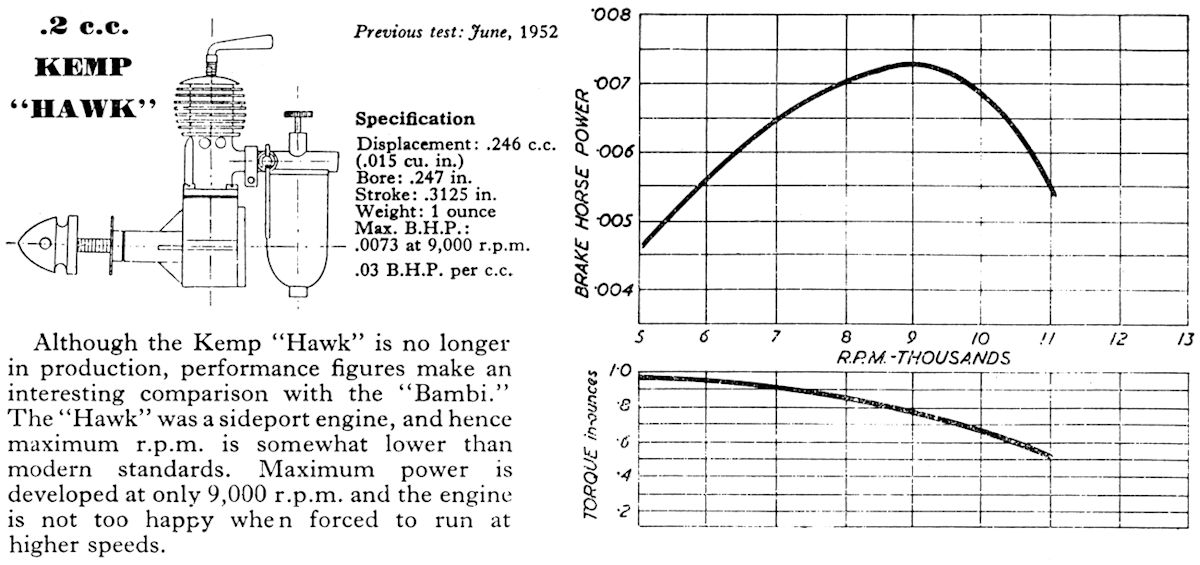 With an output of 0.086 BHP @ 8,200 RPM, the Hawk Mk. 2 topped the output of its Mk. 1 Series I sideport predecessor of similar displacement, albeit by a rather slim margin and at a slightly higher speed. However, it was no match at all for the 30% larger-displacement Mk. 1 Series II sideport variant. I suspect that my tested example of the latter model is an exceptional unit, while my well-used test example of the Mk. 2 may be somewhat sub-standard or a bit "tired".